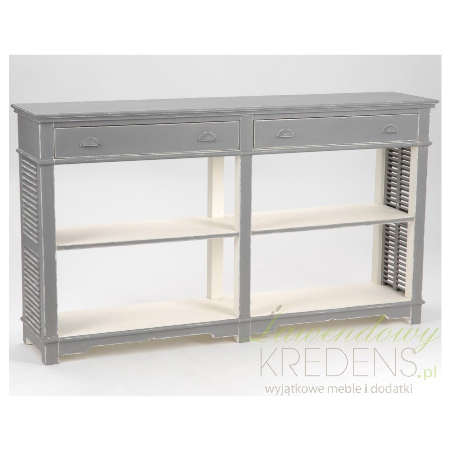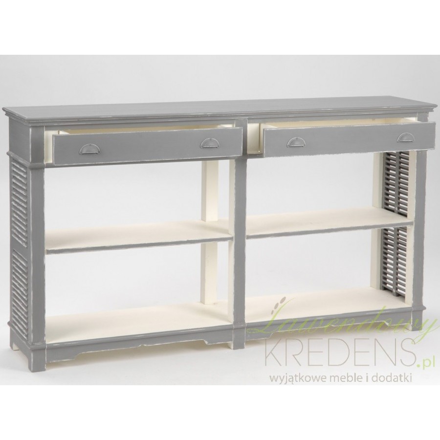 Podwójna, szara konsola w stylu prowansalskim z szerokimi szufladami i otwartymi na przestrzeń półkami!