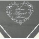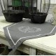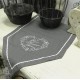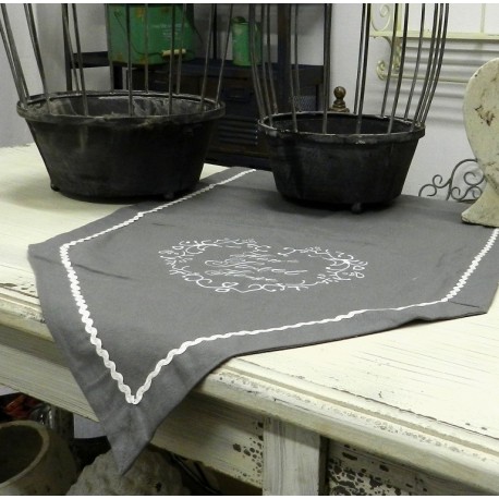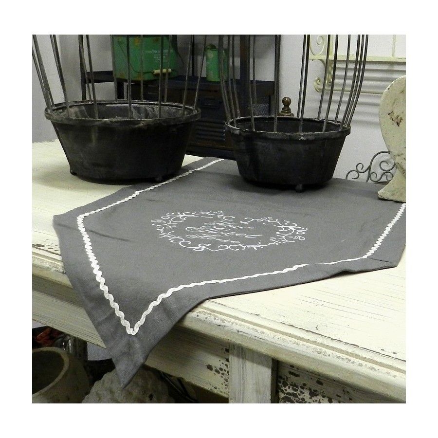 Bawełniane bieżniki na stół w szarym kolorze z naszywaną białą obwódką i elegenckim białym nadrukiem.