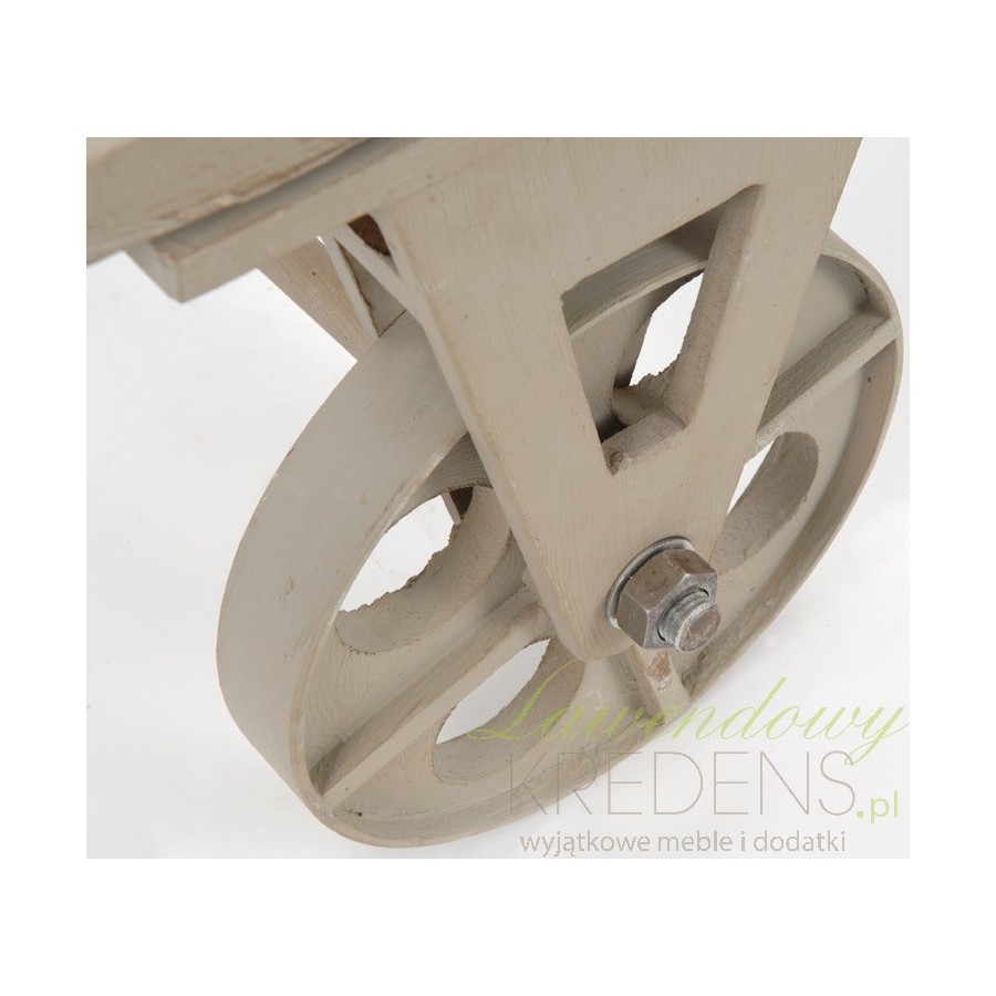 Fantastyczny stolik industrialny w jasnym kolorze wpadającym w szarość, który różni się od pozostałych kółkami! Zamiast nóg, stolik ten posiada cztery duże kółka, a całość prezentuje się jak prosta rama pojazdu! Dodatkowym elementem, który dodaje całości niezwykłego wyglądu, jest przeszklony blat!