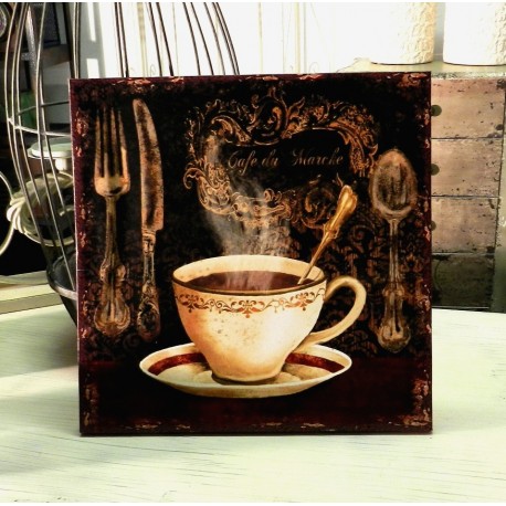 Kwadratowy obraz vintage, na którym widoczna jest filiżanka gorcej kawy, francuski napis oraz sztućce. Dzięki zastosowaniu czarnego tła obraz wygląda niezwykle stylowo i efektownie. Świetnie sprawdzi się nie tylko w kuchni i jadalni, ale także w klimatycznej kawiarni, cukierni lub restauracji.