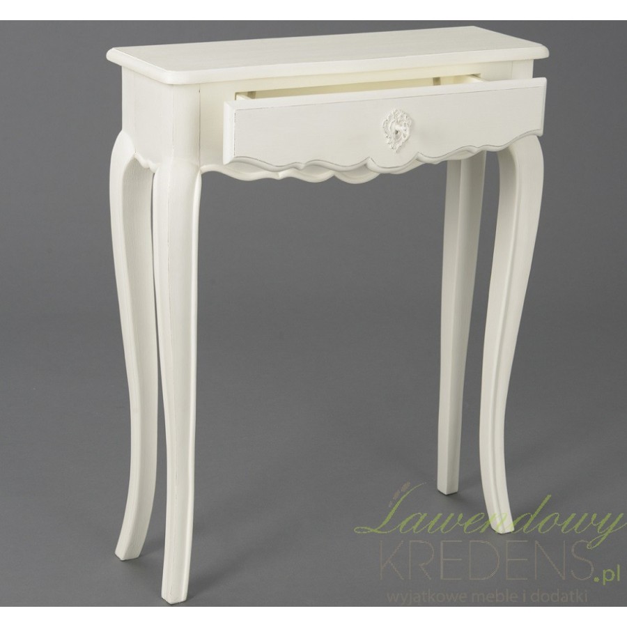 Niewielka, ale poręczna i ustawna konsola prowansalska z szeroką szufladą ozdobioną niezwykłym frontem.