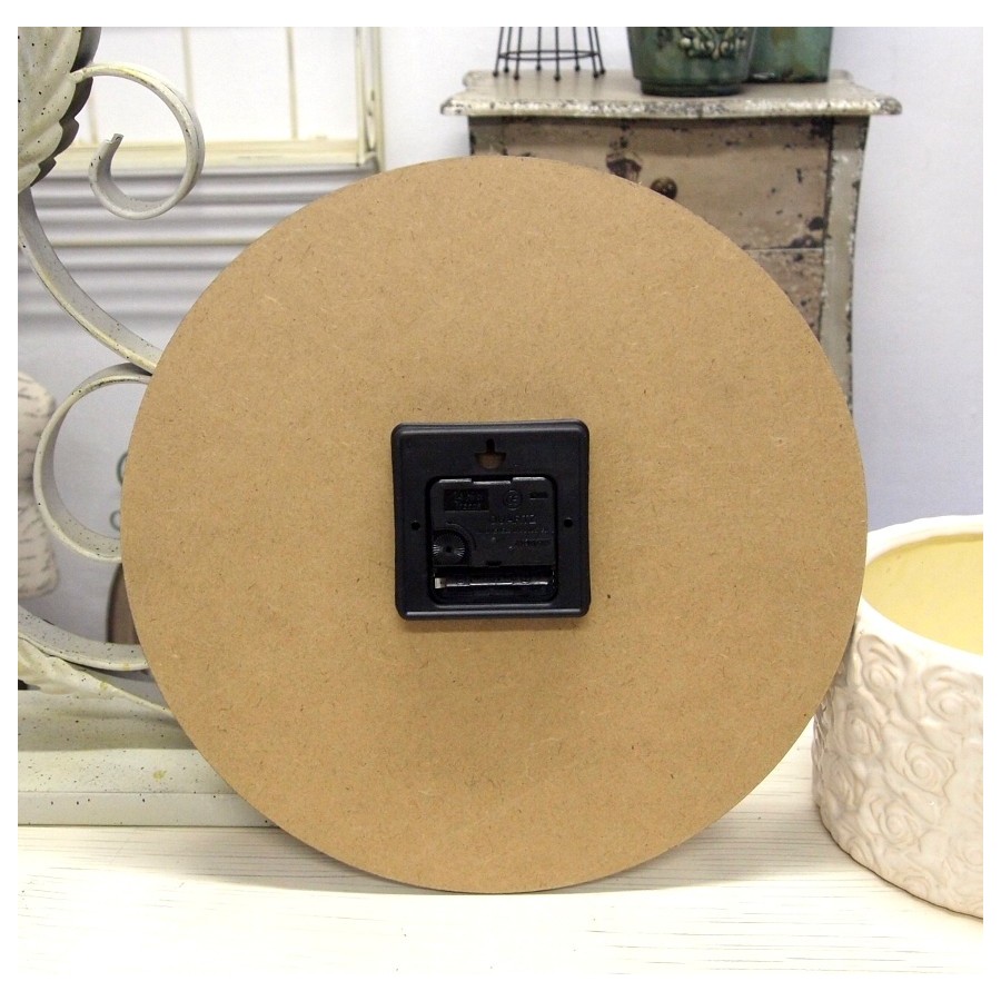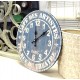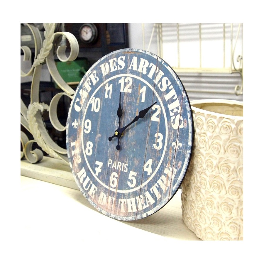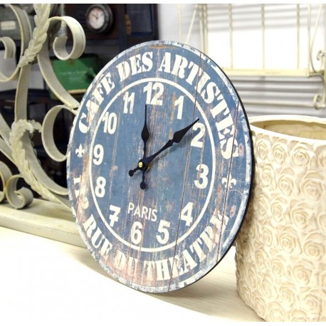 Wyjątkowy zegar retro o przepięknie i oryginalnie stylizowanej tarczy, która doskonale imituje stare, pomalowane na kolor błękitny deski. Na błękitnej tarczy znajdują się białe cyfry, napisy w języku francuskim oraz dwie lilijki.