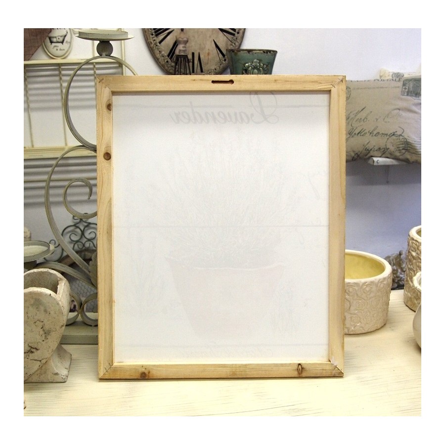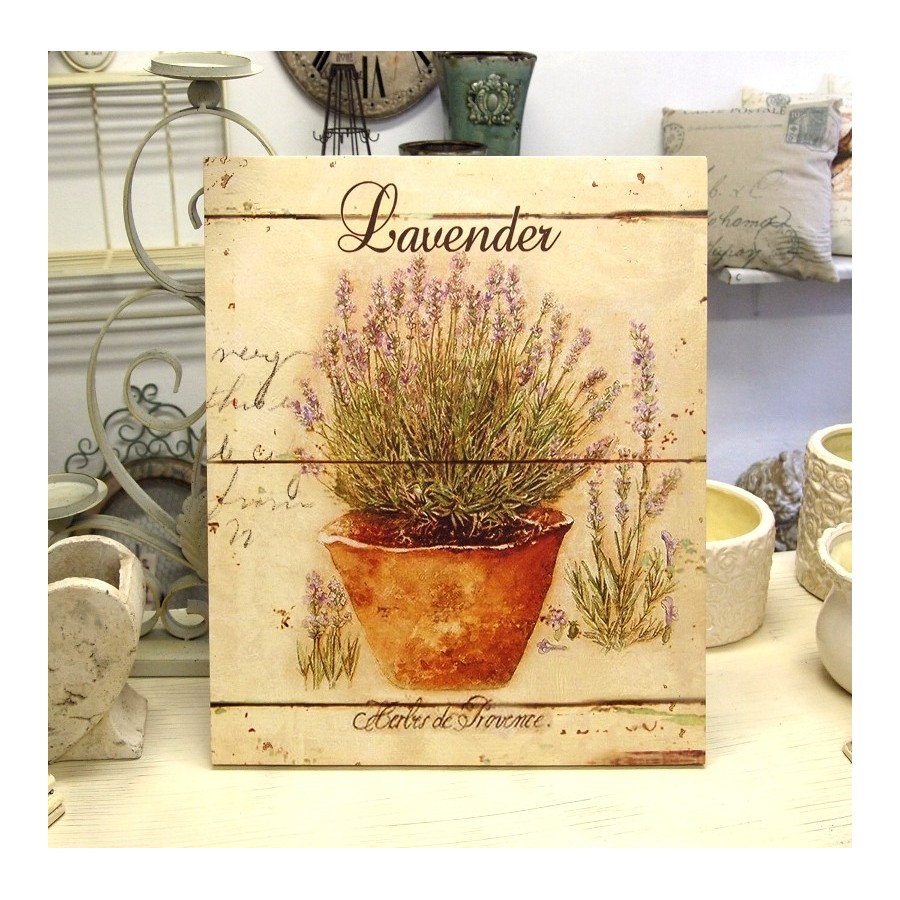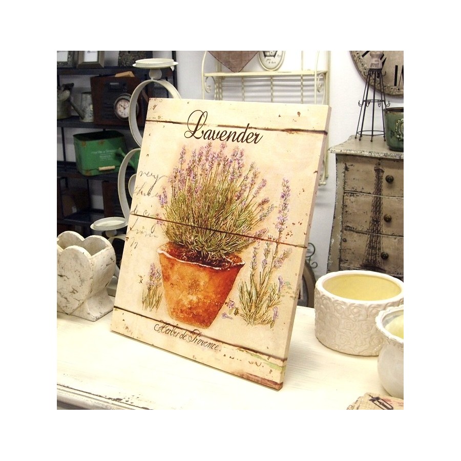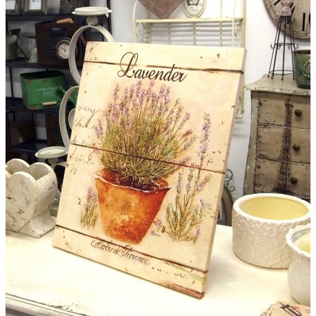 Pełne uroku obrazy w stylu prowansalskim, na których znajduje się lawenda w doniczce oraz ciemnobrązowy napis Lavender. Obrazy z lawendą imitują obrazy namalowane na drewnianych deskach. W rzeczywistości są to grafiki naciągnięte na drewniane ramy wykonane z drewna sosnowego.