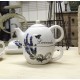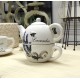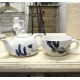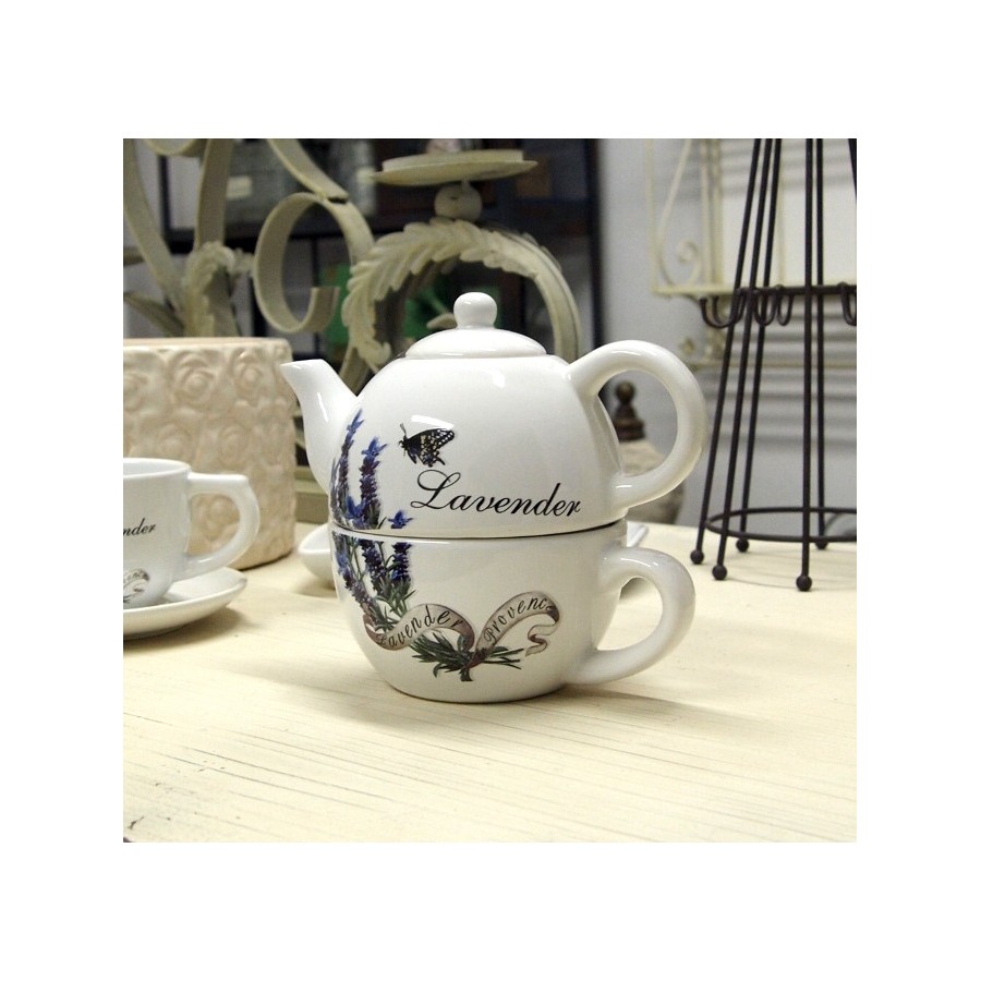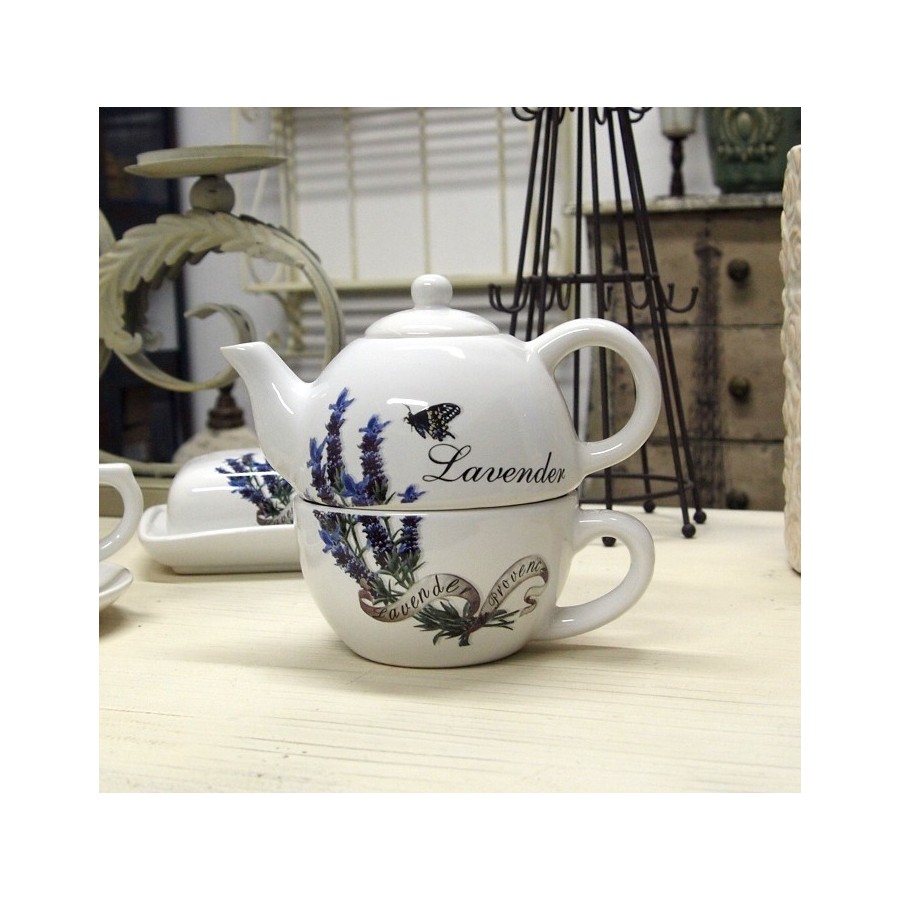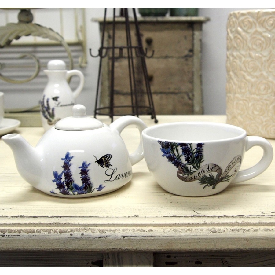 Biały dzbanek z filiżanką, czyli dzbanek w stylu prowansalskim wykonany z ceramiki z motywem lawendy.