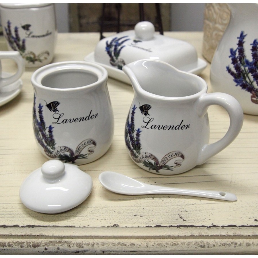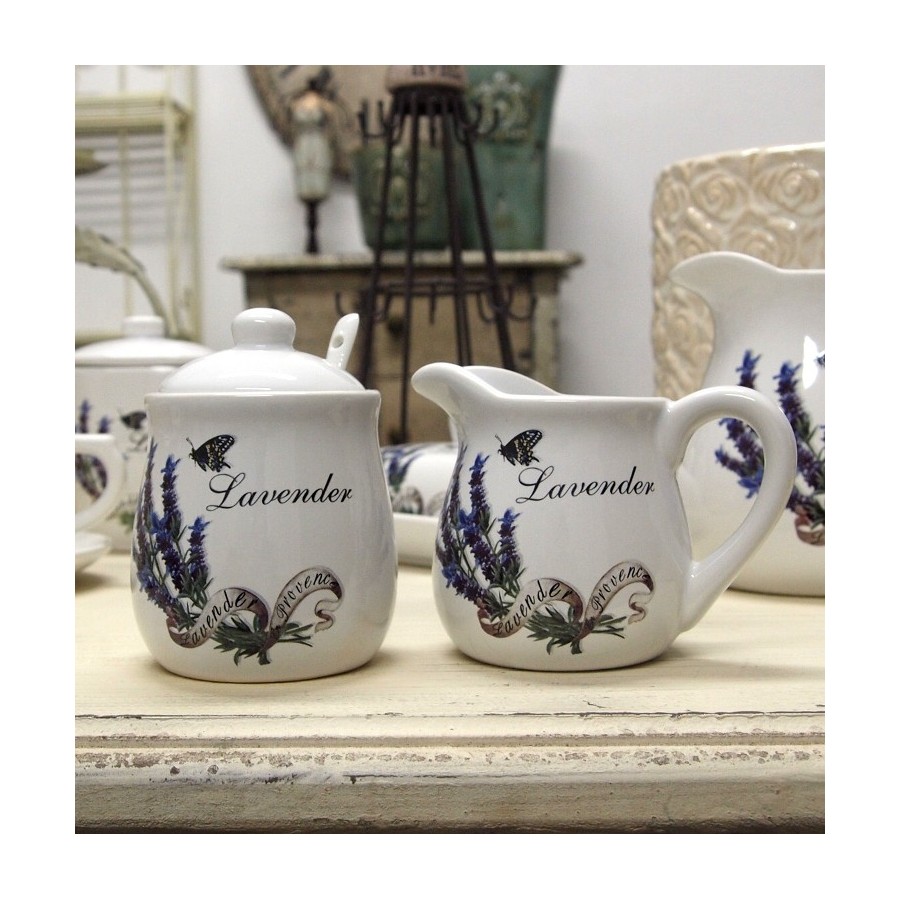 Ceramiczny mlecznik i cukierniczka z motywem lawendy, stylizowane na styl prowansalski. Ten uroczy zestaw to pięknie wyglądająca ceramika w stylu prowansalskim, która będzie piękną ozdobą każdej kuchni. W zestawie oprócz mlecznika i cukiernicy znajduje się ceramiczna łyżeczka. Do zestawu można dobrać pozostałe elementy ceramiki kuchennej z motywem lawendy, takie jak kubki, filiżanki czy dzbanki do herbaty.