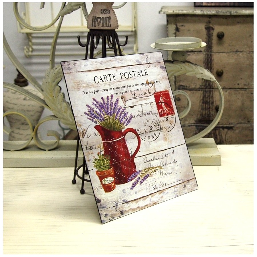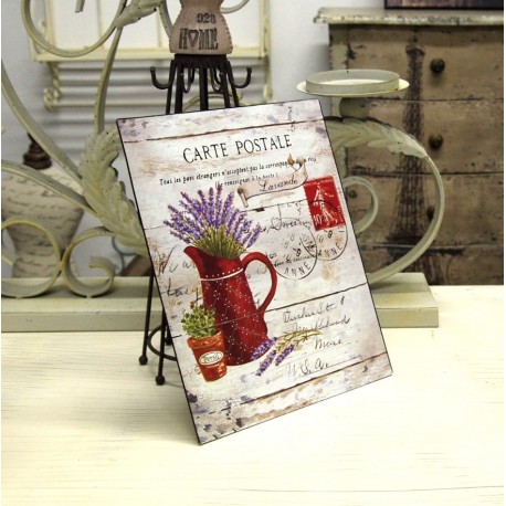 Metalowe obrazki w stylu prowansalskim z motywem lawendy, francuskimi napisami oraz czerwonym znaczkiem pocztowym. Obrazki z lawendą są stylizowane na stare prowansalskie obrazki wykonane na poziomych deskach. Do obrazków polecamy inne dodatki i ozdoby z lawendą, takie jak termometry, podkładki korkowe czy zegary ścienne.