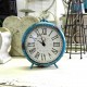 Oryginalny budzik retro w kolorze błękitnym z czerwonymi przetarciami i białymi kropkami.