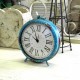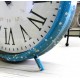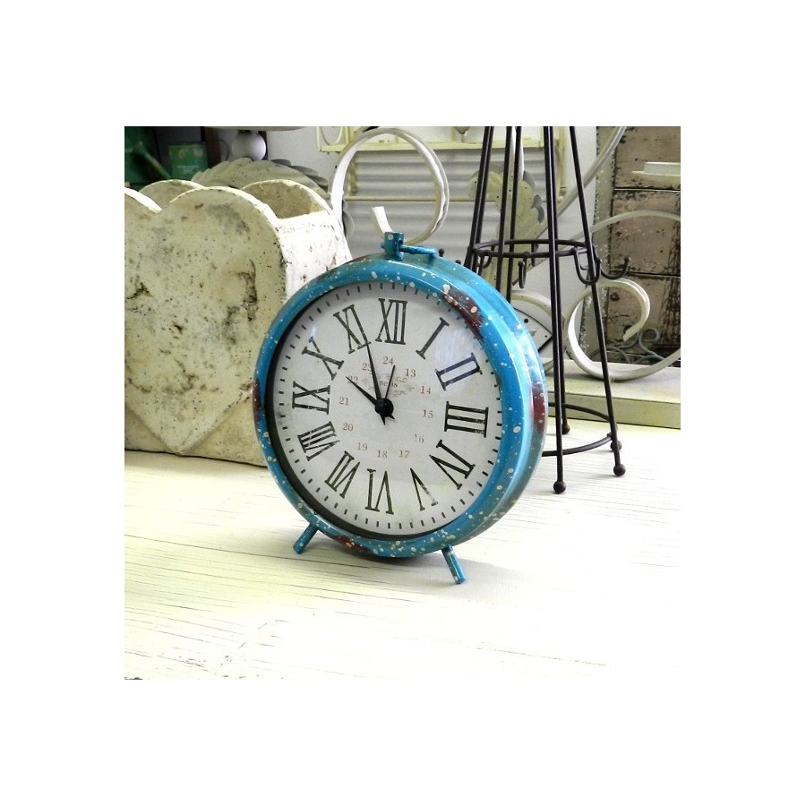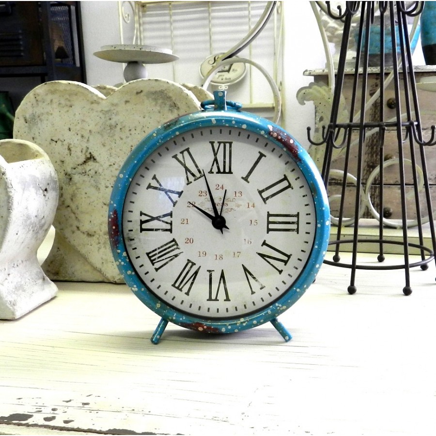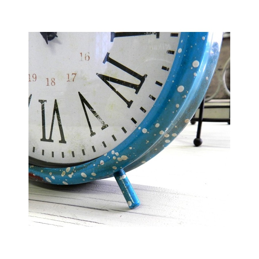 Budzik Retro to stylowy, stojący zegar z budzikiem o błękitnym kolorze z czerwonymi przetarciami i białymi kropkami. Zegar wygląda bardzo oryginalnie, oprócz czarnych, rzymskich cyfr na jego tarczy widoczne sa także czerwony cyfry arabskie oraz mały, czerwony napis "paris".