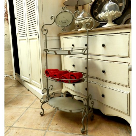 Szary, metalowy stojak łazienkowy Belldeco w stylu prowansalskim z trzema półeczkami.