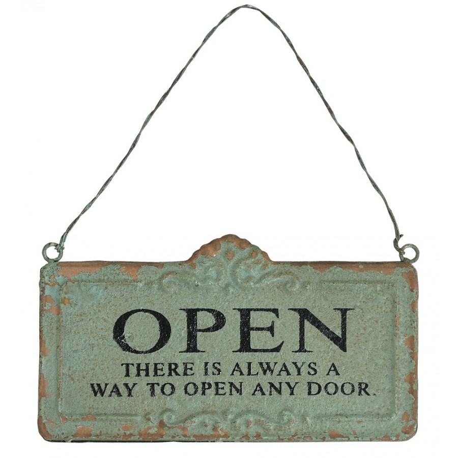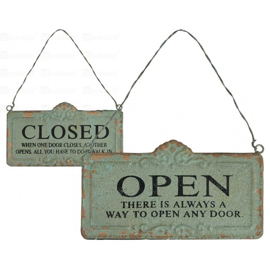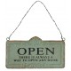 Retro Zawieszka Open to dwustronna zawieszka Belldeco wykonana z metalu. Zawieszka ma elegancki kształt, a do jej zaweiszenia służy dołączony do zawieszki drucik. Zawieszka ma zielonkawy kolor z rdzawymi przetarciami oraz czarnymi napisami.