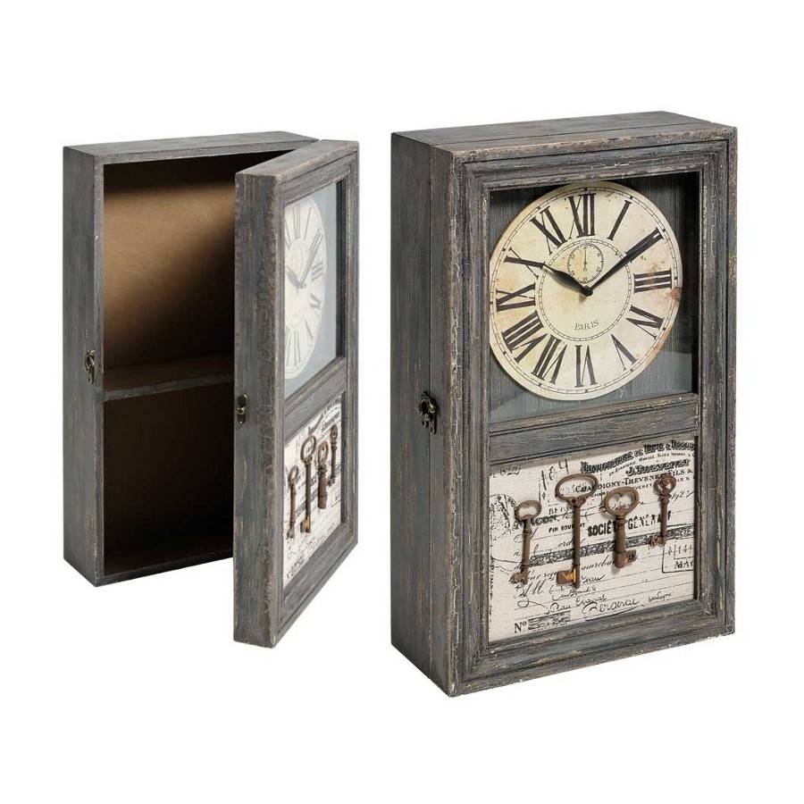 Retro Szafka z Zegarem to drewniana szafka Belldeco o kremowo-szarej kolorystyce. W górnej części drzwiczek szafki znajduje się kremowy zegar zasilany jedną baterią AA. W dolnej części drzwiczek znajdują się natomiast ozdobne klucze na tle rozmaitych napisów.