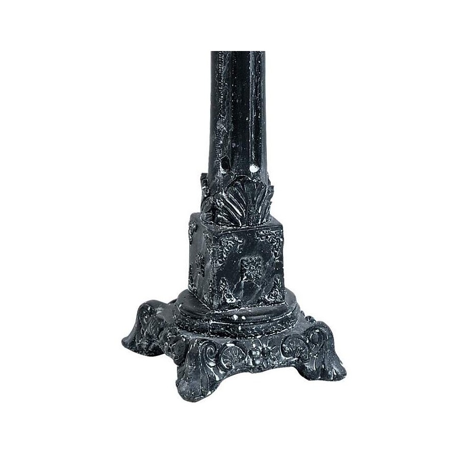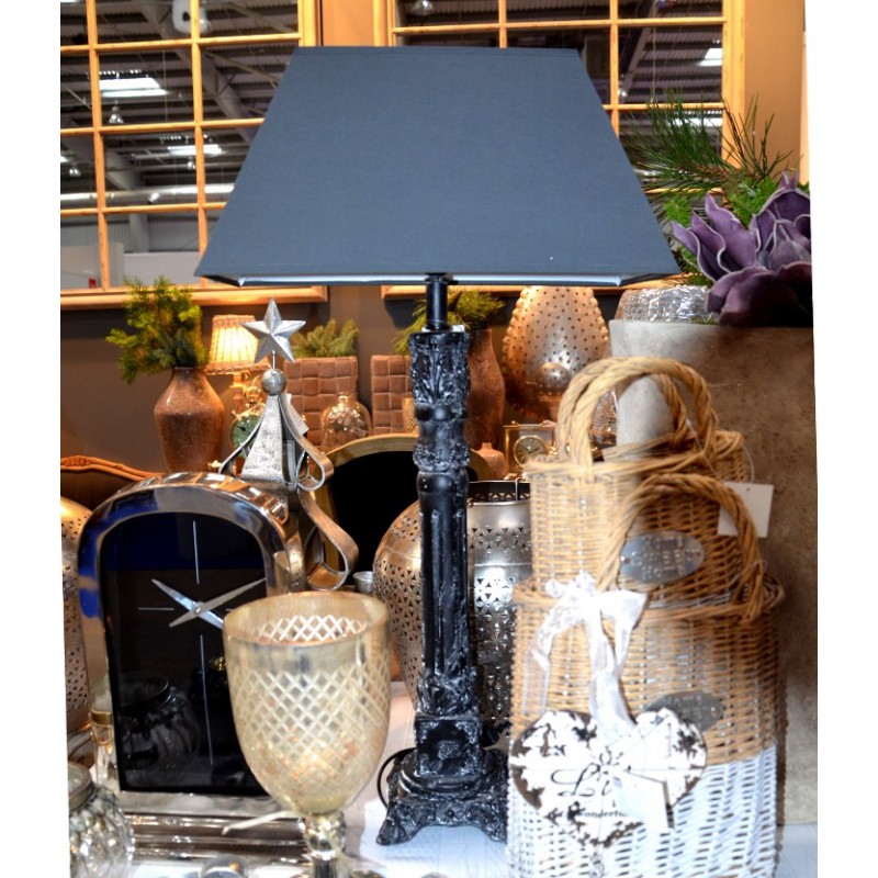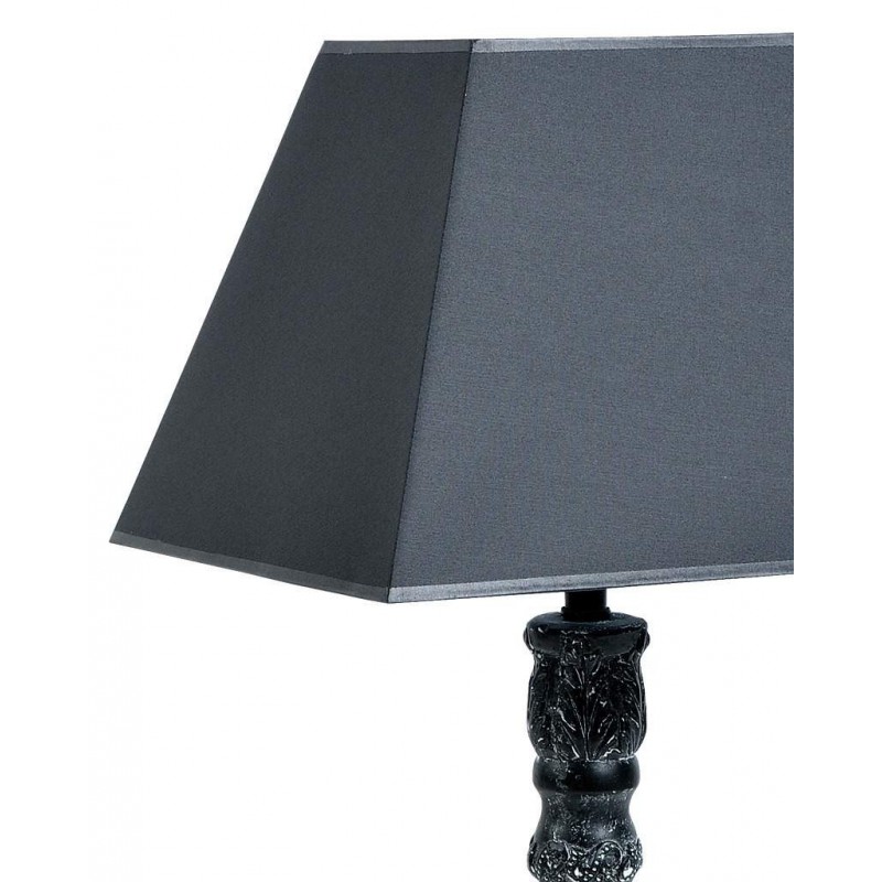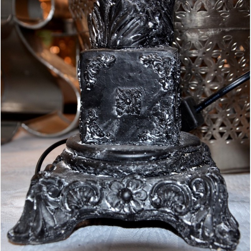 Lampa z abażurem Garden Old to bardzo elegancka lampa Belldeco, której podstawa ma ciekawy, ozdobny kształt. Na czarnym kolorze podstawy widoczne są białe przetarcia. Abażur lampy ma grafitowy kolor.