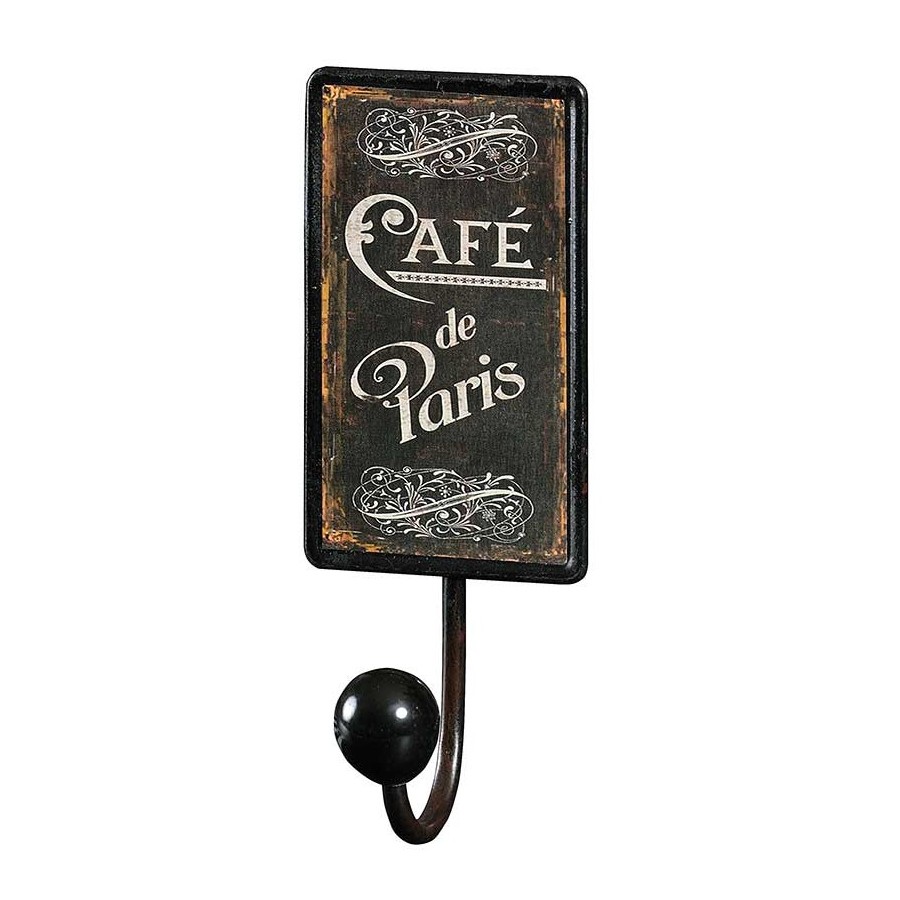 Retro wieszak Belldeco wykonany z metalu, którego wieszaczek zakończony jest czarną, ceramiczną kulką. Na ozdobnej tabliczce wieszaka widnieje napis Cafe de Paris.