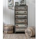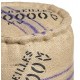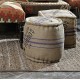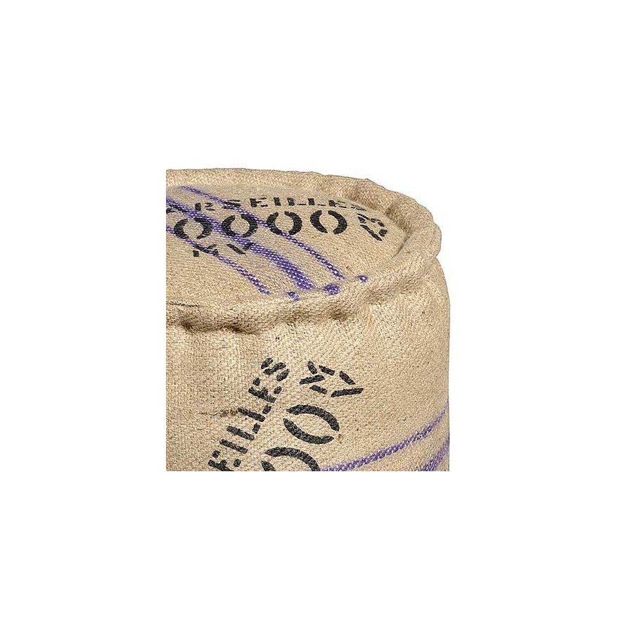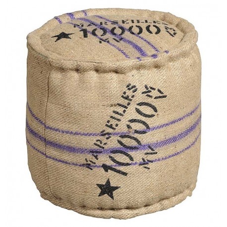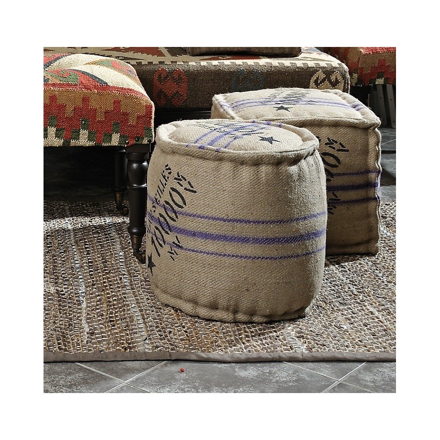 Stylowa pufa Belldeco obszyta tkaniną jutową mająca kształt walca. Pufa pochodzi z serii Loft Belldeco i znajdują się na niej czarne napisy oraz fioletowe pasy.