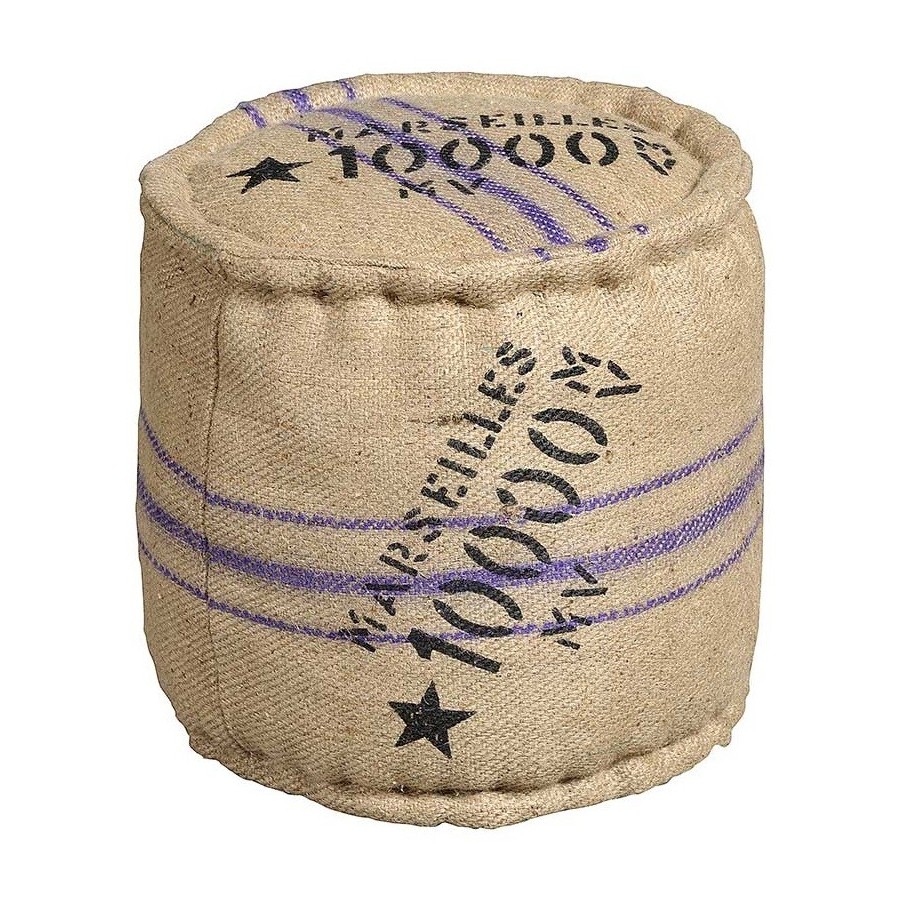 Pufa Belldeco z serii Loft w kształcie walca, obszyta tkaniną jutową. Na pufie znajduje się czarno-fioletowa grafika.