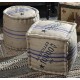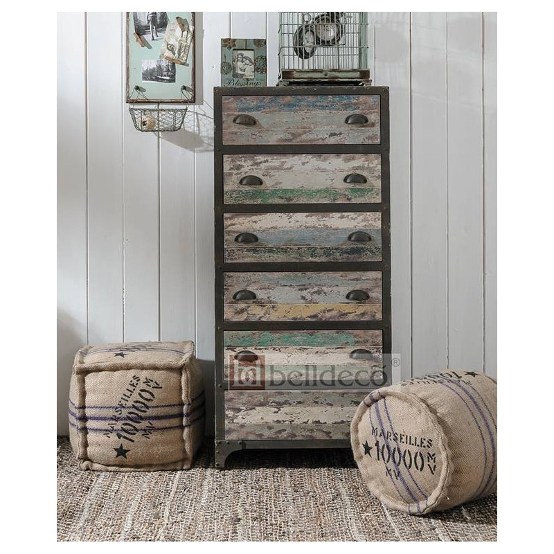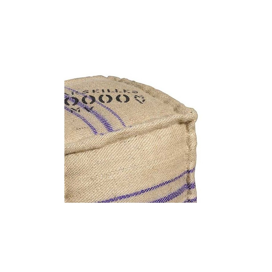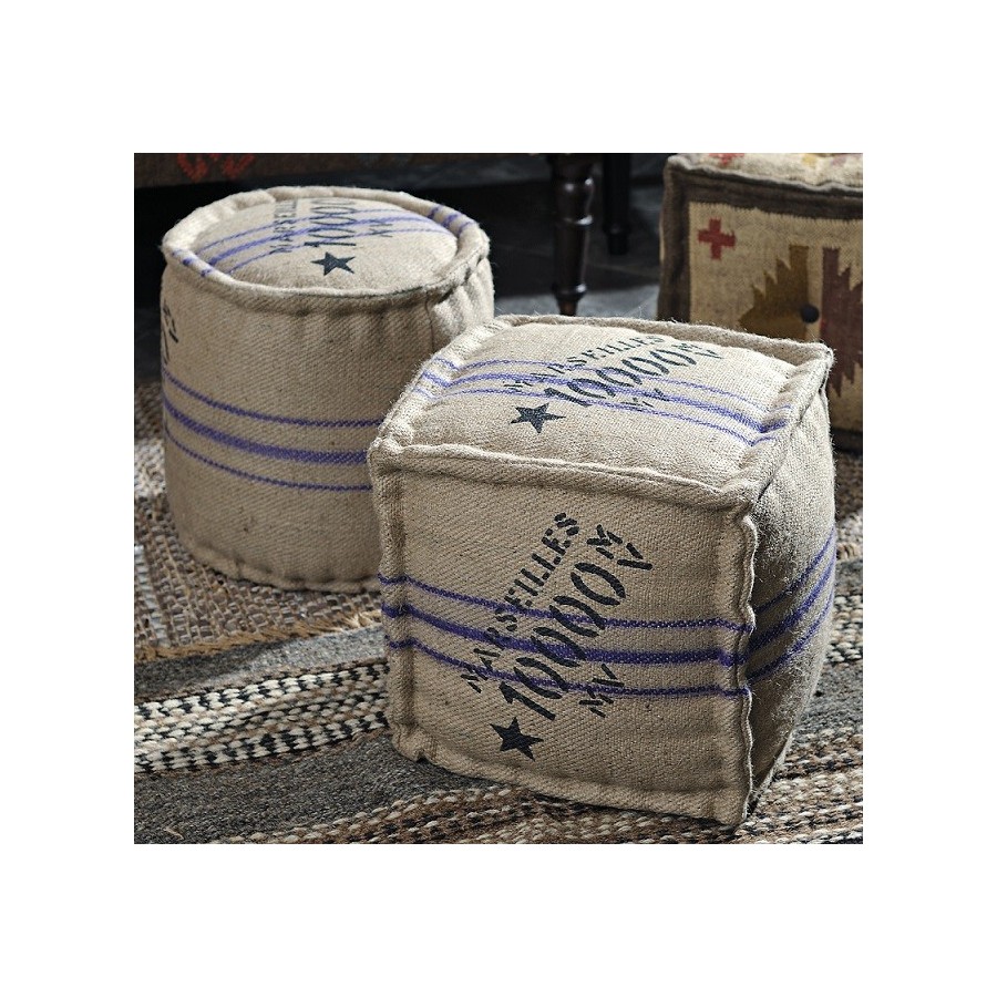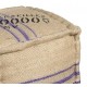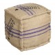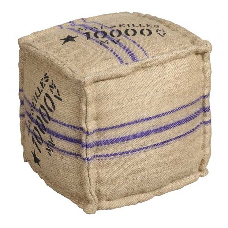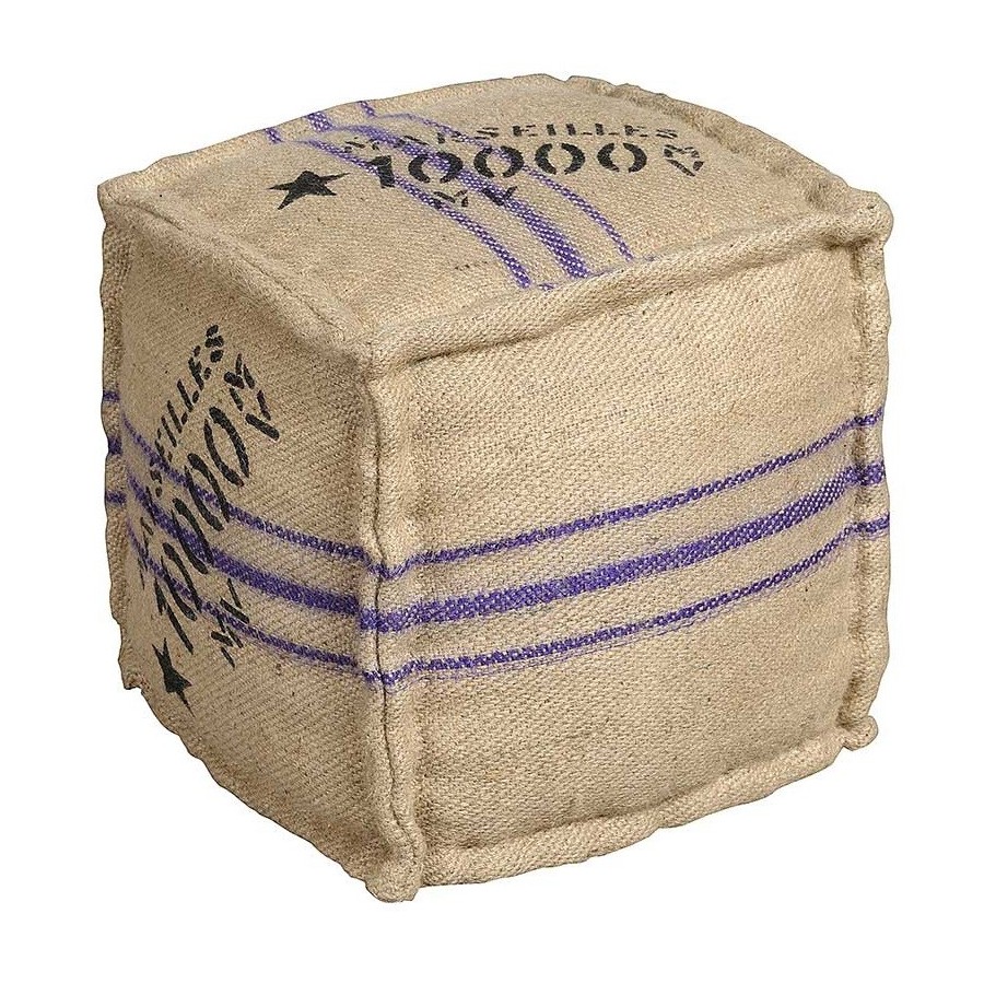 Loft Puf Kostka to obszyta tkaniną jutową, stylowa pufa Belldeco w kształcie sześcianu. Na pufie znajdują się czarne napisy oraz fioletowe pasy.