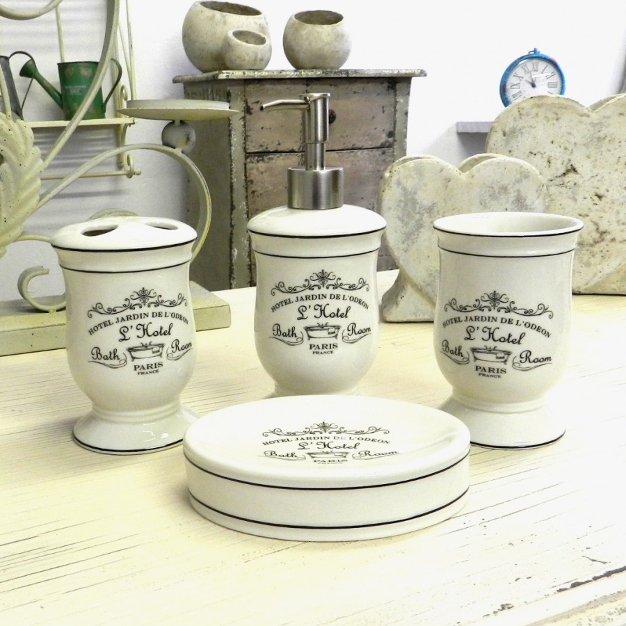Zestaw Łazienkowy Paris to stylowe, ceramiczne dodatki do łazienki w stylu prowansalskim. Na zestaw składają się cztery elementy: pojemnik na mydło ze srebrnym dozownikiem, kubek na wodę, pojemnik na szczoteczki oraz gruba mydelniczka. Cały zestaw wykonany jest z wysokiej jakości ceramiki o kreowym kolorze, na której widnieją stylowe, francuskie napisy oraz grafika przedstawiająca wolnostojącą wannę z ręcznikiem.