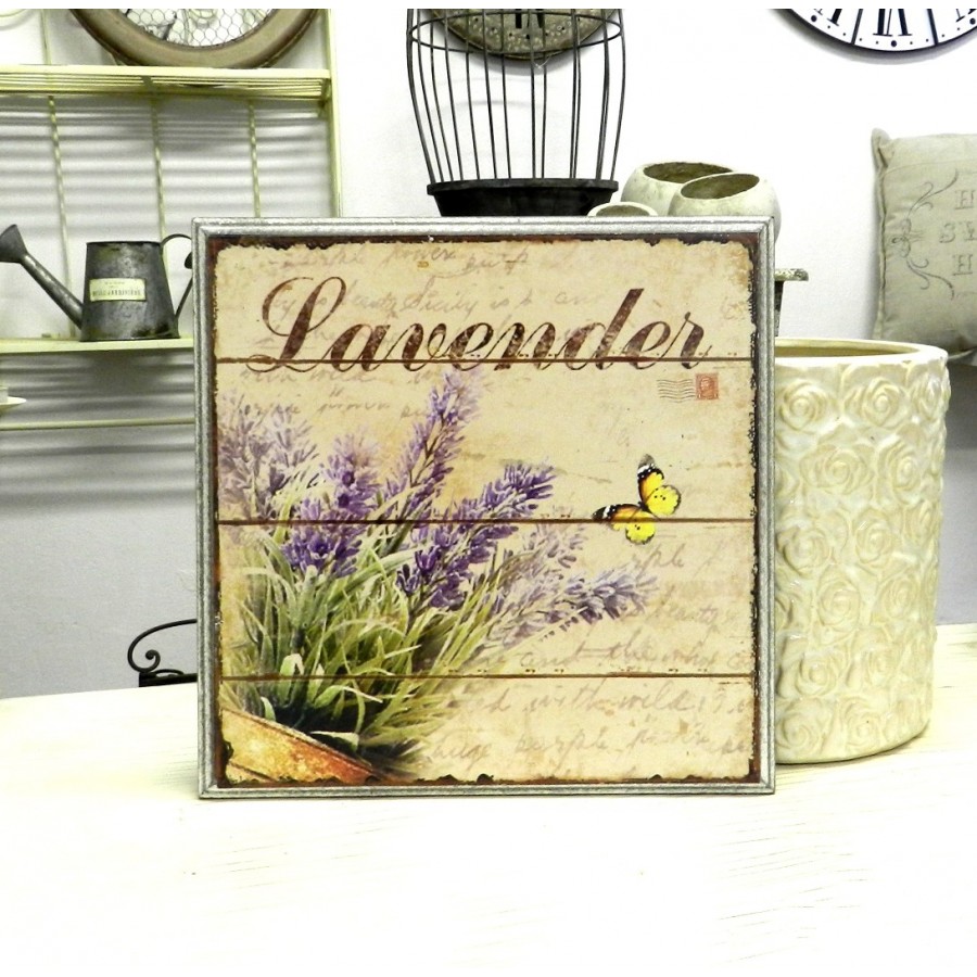 Prowansja Obrazki Lawenda to drewniane, prowansalskie obrazki Belldeco na których widnieje napis Lavender, motyw lawendy oraz żółty motylek.