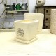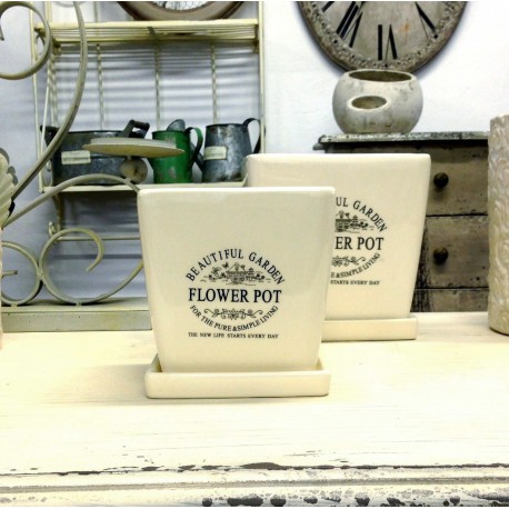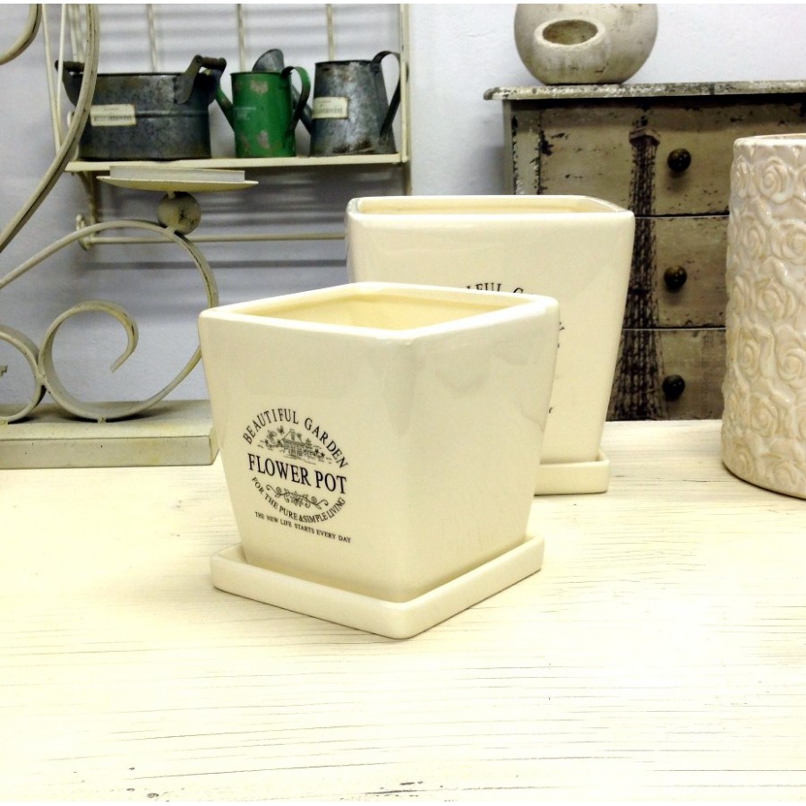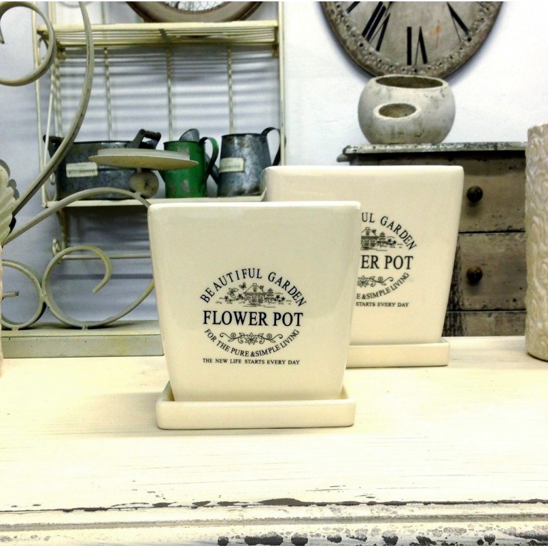 Ceramiczna doniczka z podstawą w kremowym kolorze. Na doniczce widnieją czarne napisy, a podstawka ma kształt kwadratu. Doniczki lekko rozszerzają się ku górze.