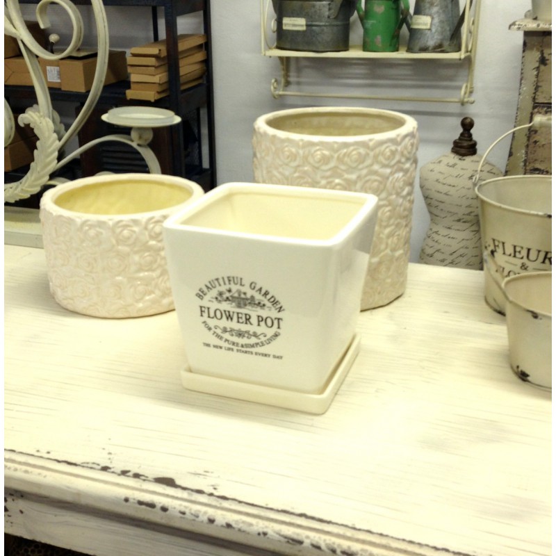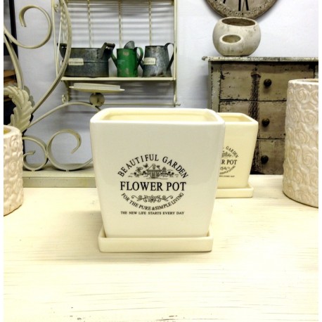 Kremowa, ceramiczna doniczka z podstawką i czarnymi napisami w języku angielskim.