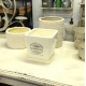 Stylowa, ceramiczna doniczka z podstawką w kształcie kwadratu, na której znajdują się czarne napisy. Doniczki mają elegancki, rozszerzający się ku górze kształt.
