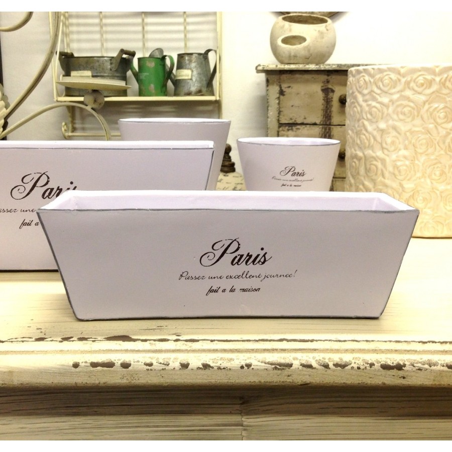 Piękne, podłużne osłonki z napisami w języku francuskim. Osłonki mają jasny, lawendowy kolor i są celowo postarzane. Na ich krawędziach widoczne są szare przetarcia, stylowo przetarte są także znajdujące się po jednej stronie osłonki, francuskie napisy. Osłonki podłużne są idealne zarówno na zioła jak i kwiaty.