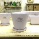 Jasna, ceramiczna doniczka z podstawką i z francuskimi napisami o lekko rozszerzającym się ku górze kształcie.