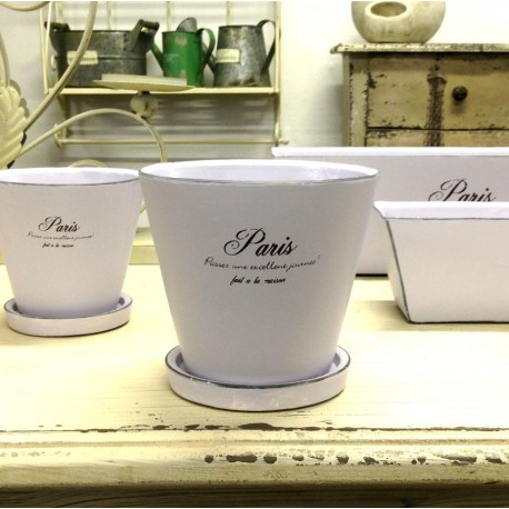 Doniczki w stylu prowansalskim z podstawkami o jasnolawendowym kolorze. Na doniczkach znajduje się napis Paris oraz inne francuskie napisy.