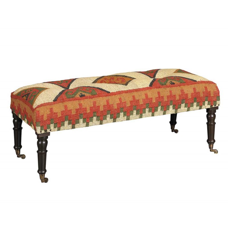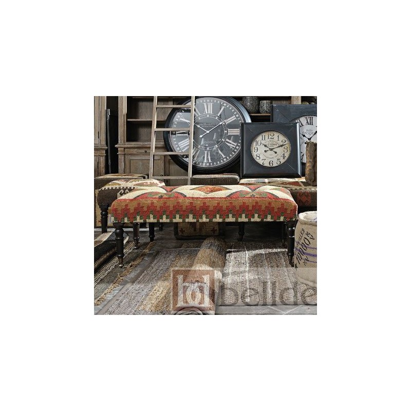 Podłużna Etno Ława Belldeco na kółkach, której tapicerka wykonana z juty oraz wełny pokryta jest etnicznymi wzorami. Nogi ławy Etno wykonane są z drewna akacjowego.