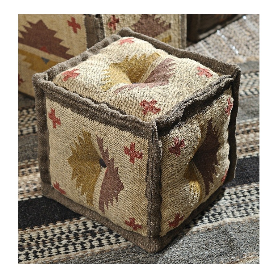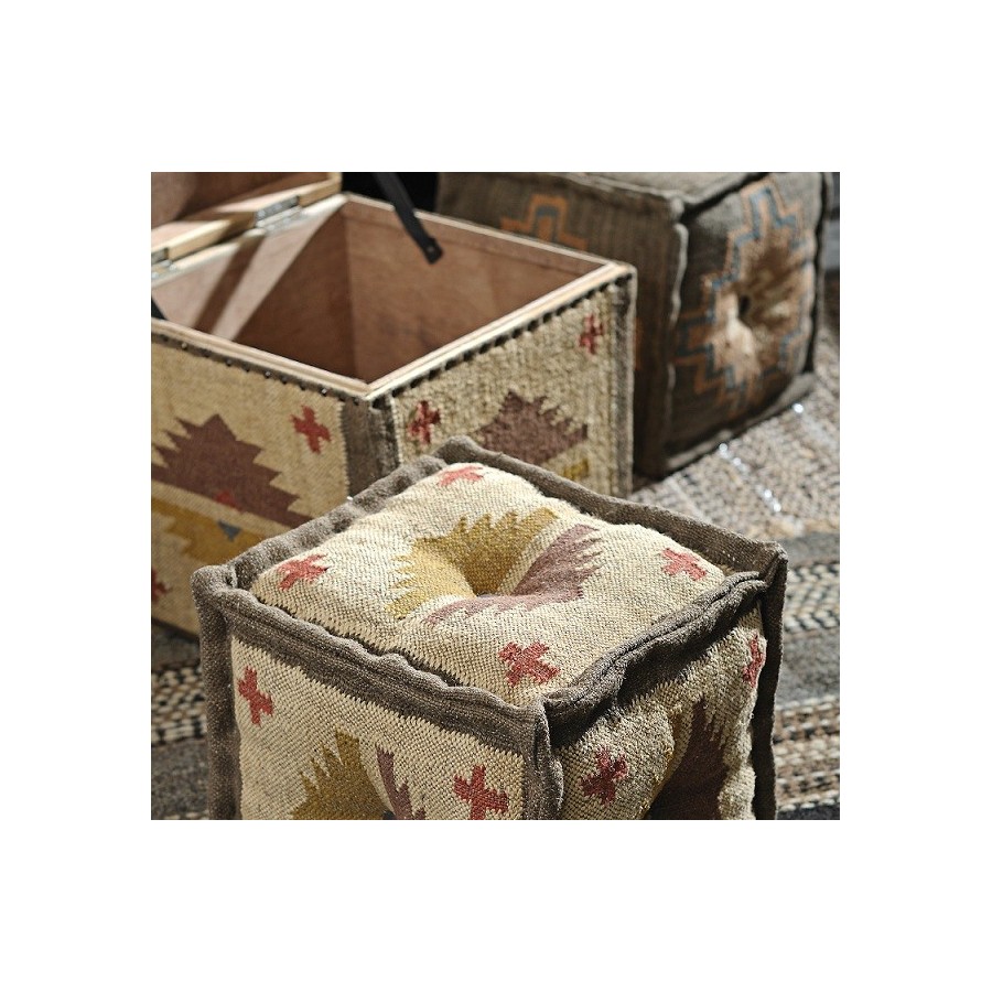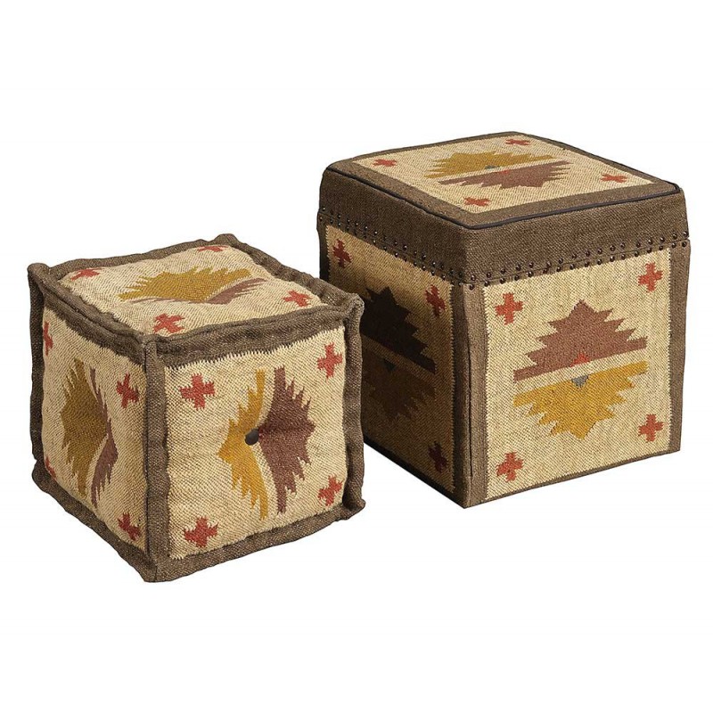 Etno Pufy Belldeco to pufy o geometrycznych, etnicznych wzorach, obite tapicerką wykonaną z juty oraz bawełny. Większy puf jest otwierany i można do niego schować mniejszy puf.