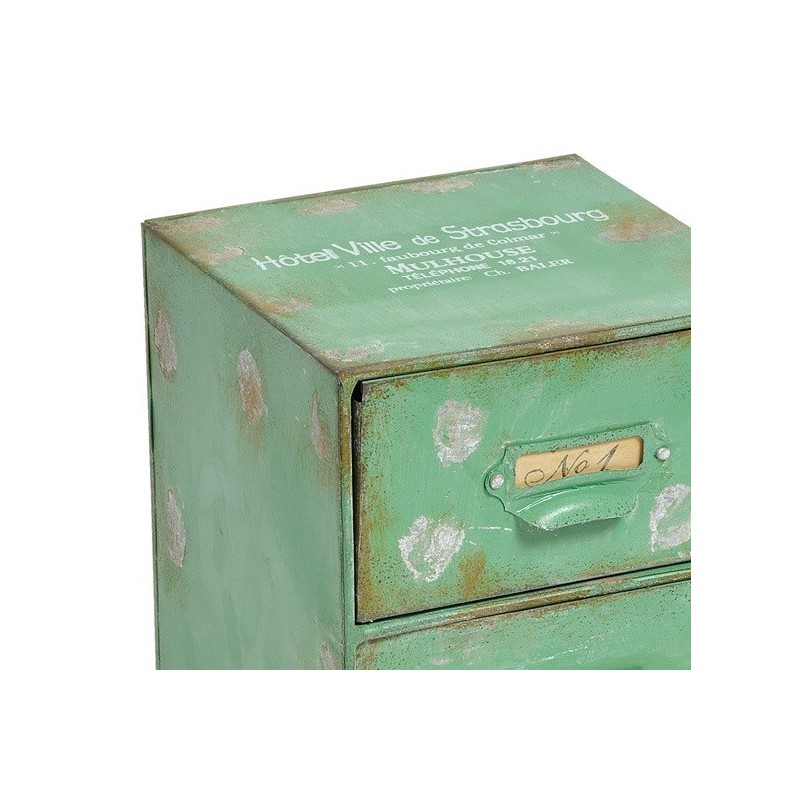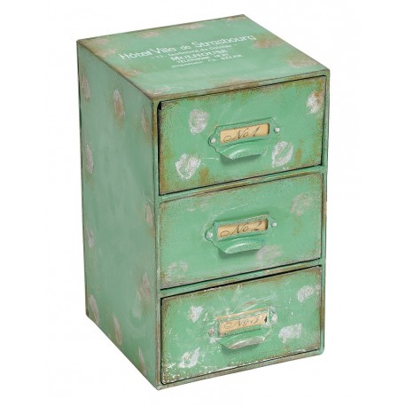 Ciekawie wyglądający pojemnik Belldeco z serii Hotel Ville Green z trzema szufladami, wykonany z metalu. W górnej części pojemnika znajdują się białe napisy.