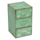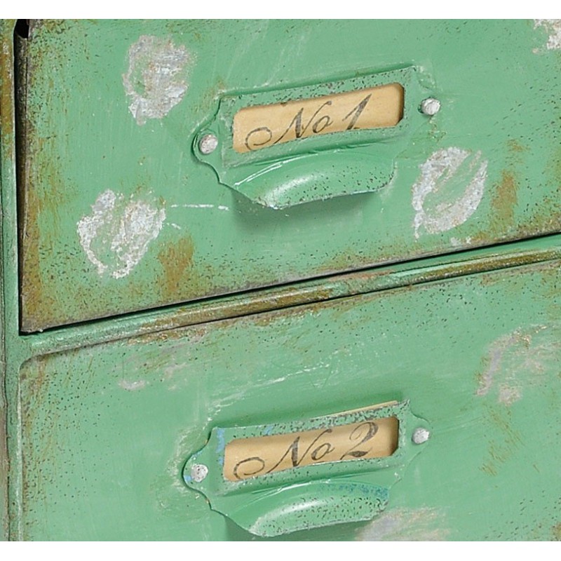 Metalowy pojemnik z szufladami marki Belldeco wykonany z pomalowanego na zielono metalu.