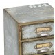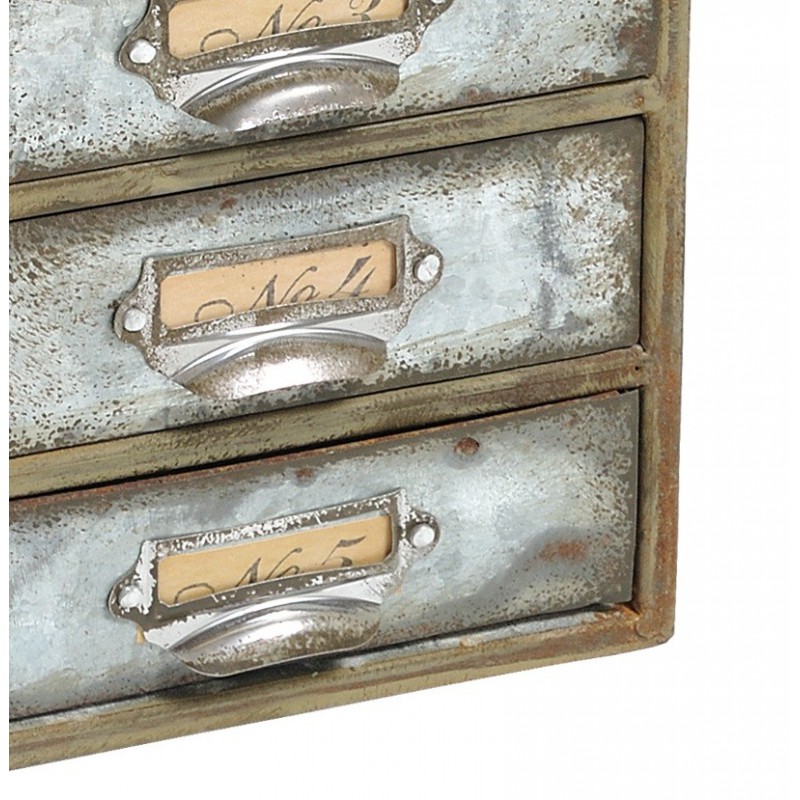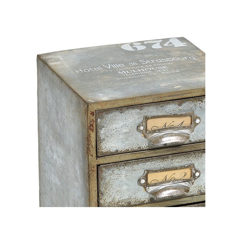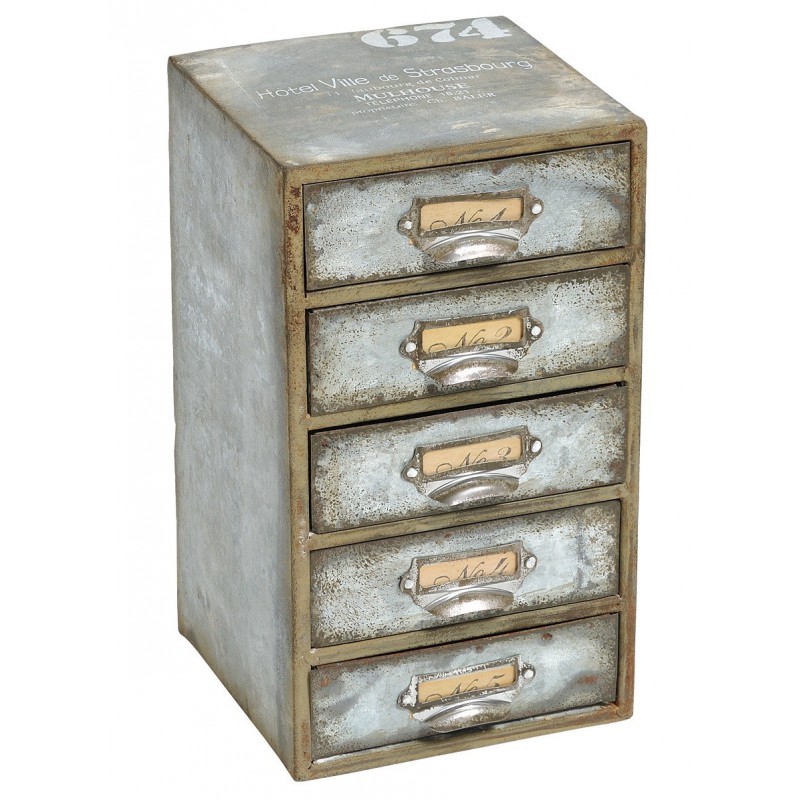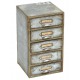 Stylowy pojemnik Belldeco z kolekcji dodatków Hotel Ville Gray wykonanych z ocynkowanej blachy. Pojemnik posiada pięć szuflad i jest ozdobiony białymi napisami.