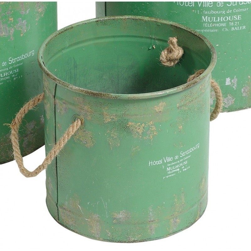 Trzy metalowe wiaderka Belldeco o różnych wymiarach z parcianymi sznurkami zamiast uchwytów.