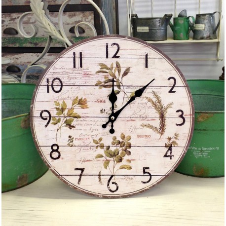 Okrągły zegar w stylu prowansalskim z motywem zioł to zegar kuchenny wykonany na płycie MDF z metalowymi wskazówkami, którego mechanizm zasilany jest jedną baterią AA.