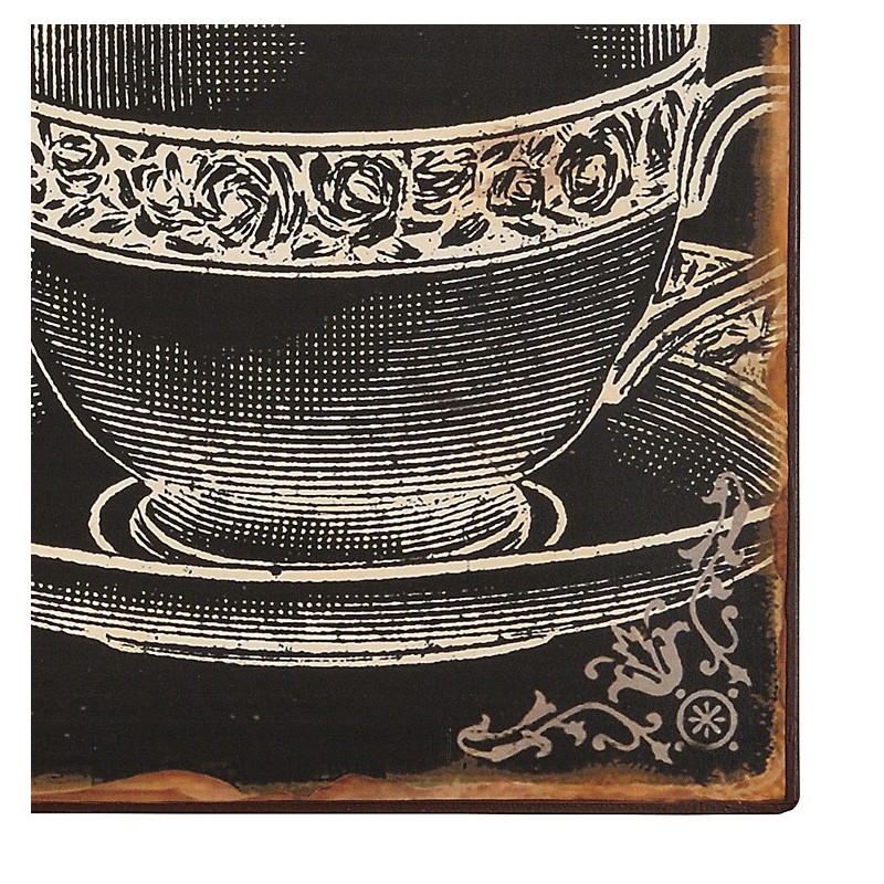 Metalowe obrazki Belldeco to świetny pomysł na ozdobienie ściany w domu, restauracji lub kawiarni! Na kwadratowych obrazkach znajduja sie kremowe oraz pomarańczowe napisy i wzorki oraz filiżanka na spodku.