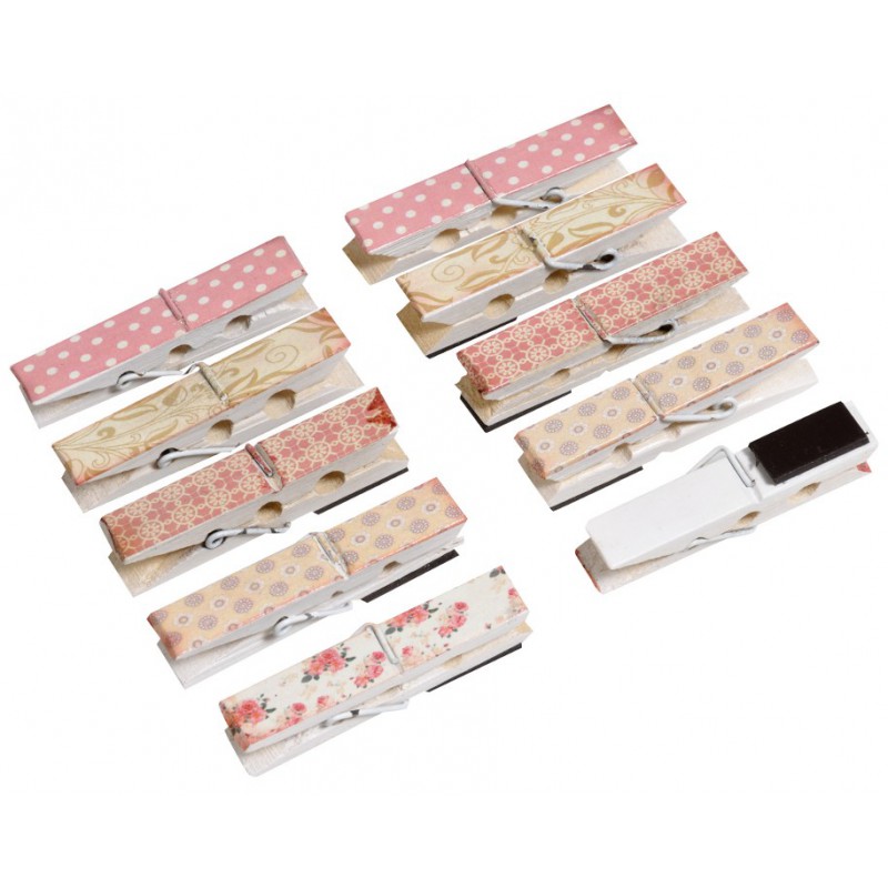 Drewiane klamerki Belldeco z magnesem idealne do przyczepiania notatek lub zdjęć do lodówki czy tablicy magnetycznej. W zestawie znajduje się dziesięć klamerek o pięciu różnych wzorach.
