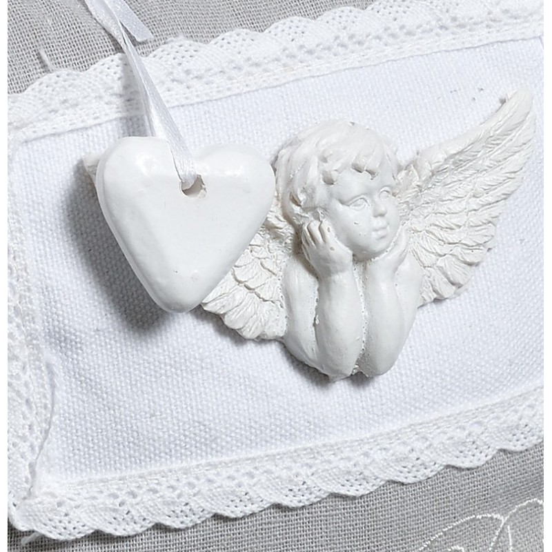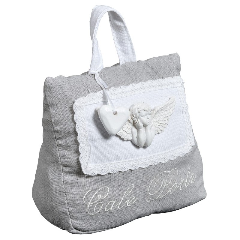 Stoper do drzwi z serii Romantic Belldeco o szaro-białej kolorystyce, ozdobiony aniołkiem i serduszkiem.
