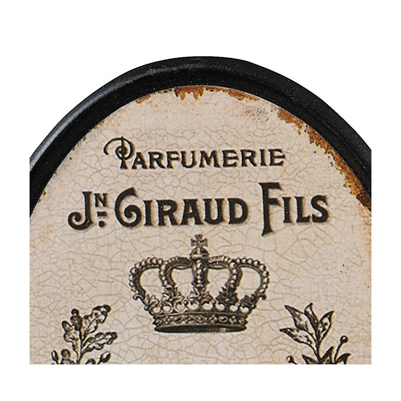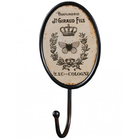 Wieszak Retro Parfumerie to metalowy wieszak Belldeco na którym znajduje się ciekawa grafika z motylkiem, koroną oraz z francuskimi napisami.