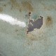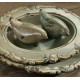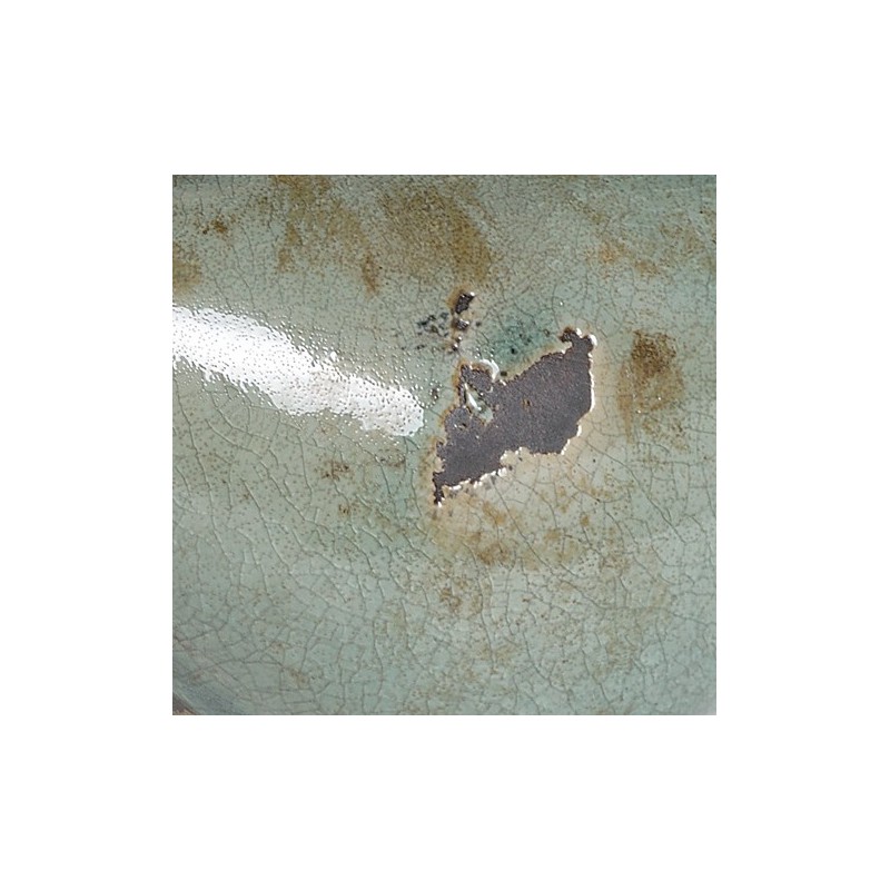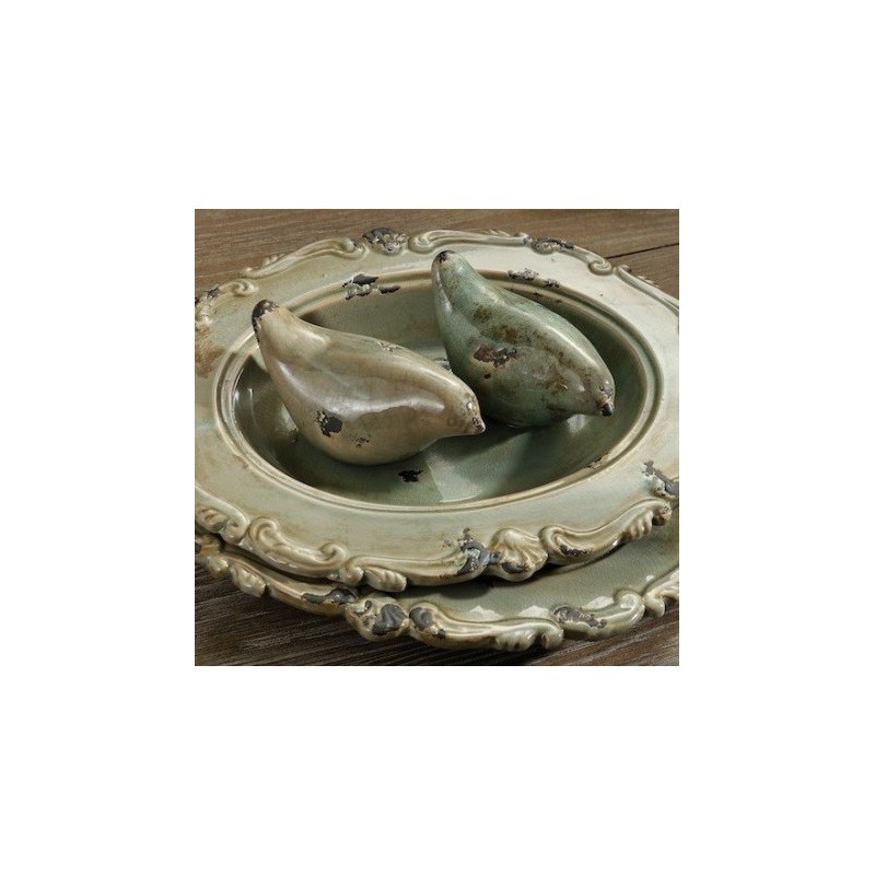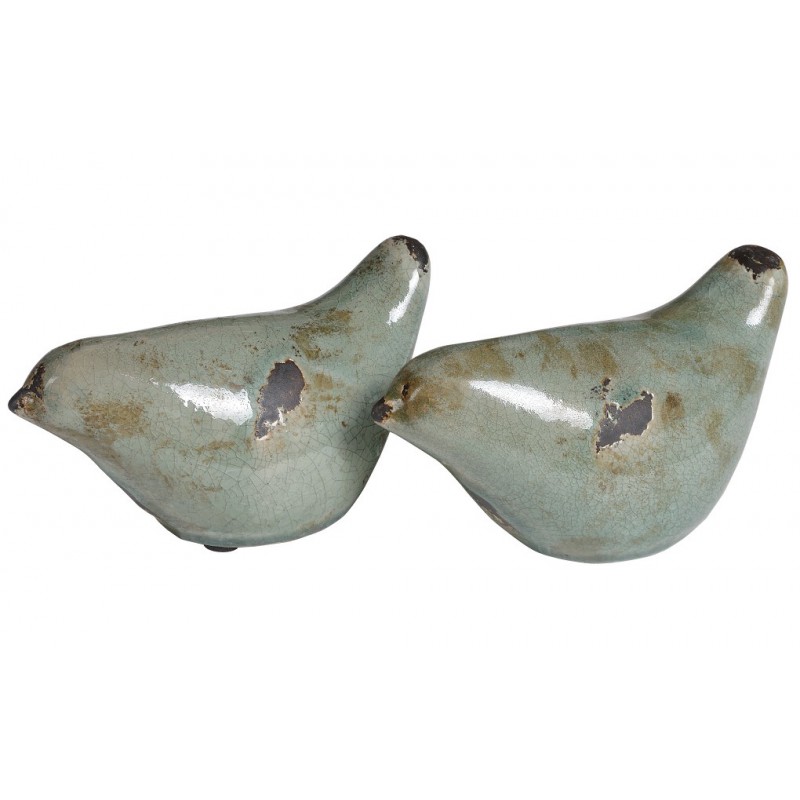 Ceramiczny ptaszek Belldeco o zielonkawym kolorze z licznymi spękaniami, beżowymi plamkami i przetarciami.