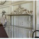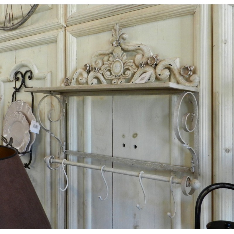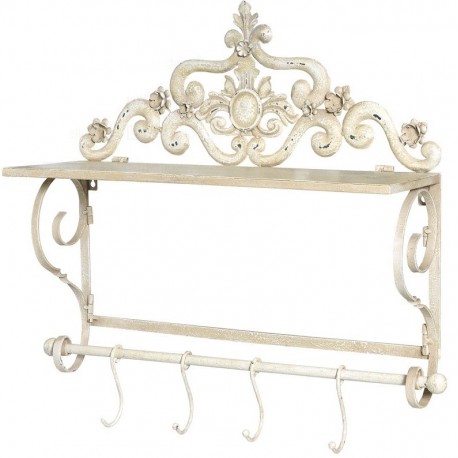 Metalowe półki Belldeco w stylu prowansalskim z praktyczną półeczką oraz czterema haczykami, które mogą posłużyć do zawieszenia ubrań w przedpokoju czy ręczników w łazience. Powierzchnia półki ma chropowatą fakturę i znajdują się na niej ciemne przecierki w stylu shabby chic.