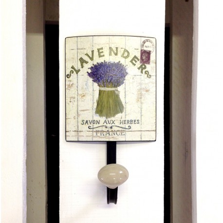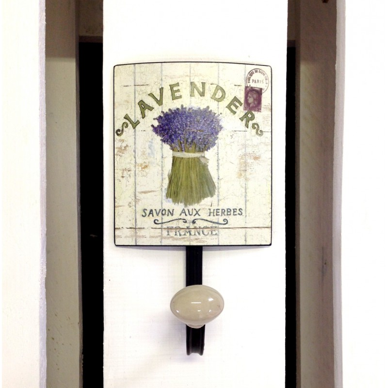 Prowansja Wieszak Lawenda to pojedynczy, metalowy wieszak w stylu prowansalskim z motywem lawendy. Oprócz bukietu lawendy na wieszaczku znajdują się francuskie napisy, a w prawym górnym rogu także znaczek pocztowy oraz pieczątka. Prowansalskie, ozdobne wieszaki ścienne to urocza dekoracja będąca połączeniem wieszaczka z obrazkiem.