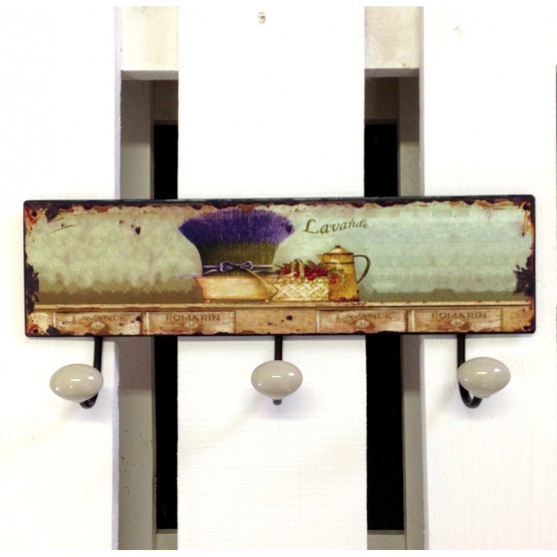 Wieszaki ścienne w stylu prowansalskim z nadrukiem na którym widnieje motyw lawendy.