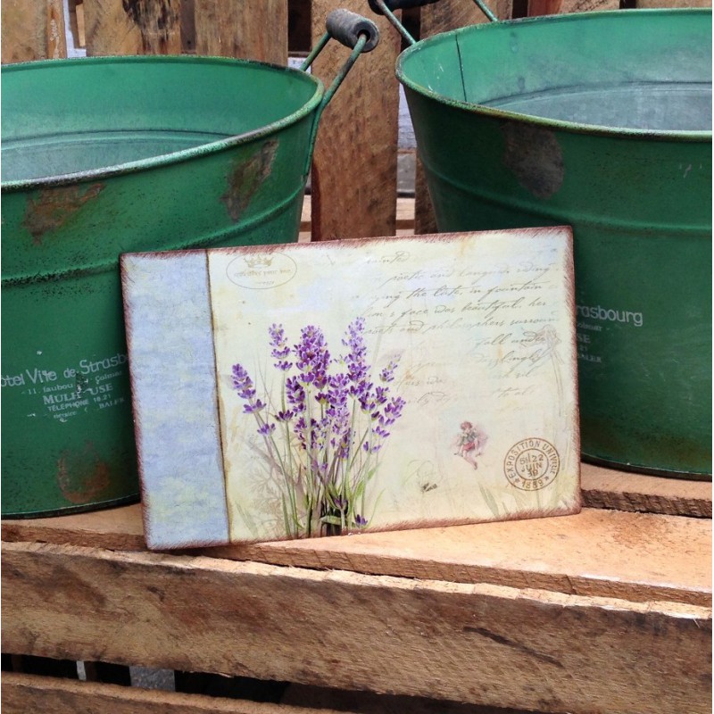 Metalowe tabliczki w stylu prowansalskim z motywem lawendy na żółtawym tle.