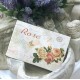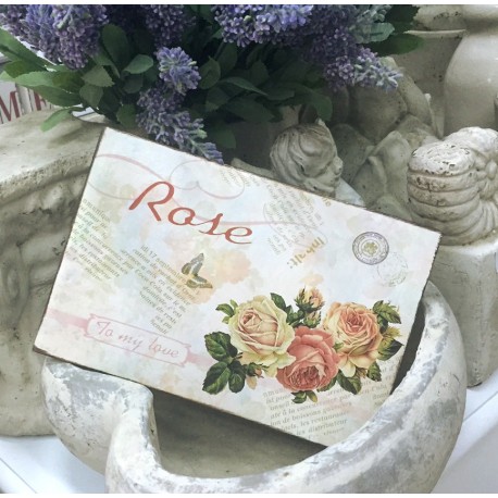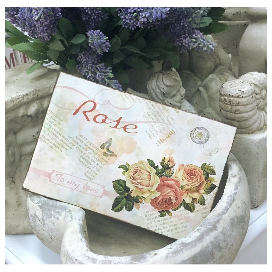 Metalowe tabliczki z motywem róż i napisem Rose na bladoróżowym tle. Tabliczki te są uroczymi dodatkami w stylu prowansalskim, które można zawiesić na ścianie w każdym pomieszczeniu.