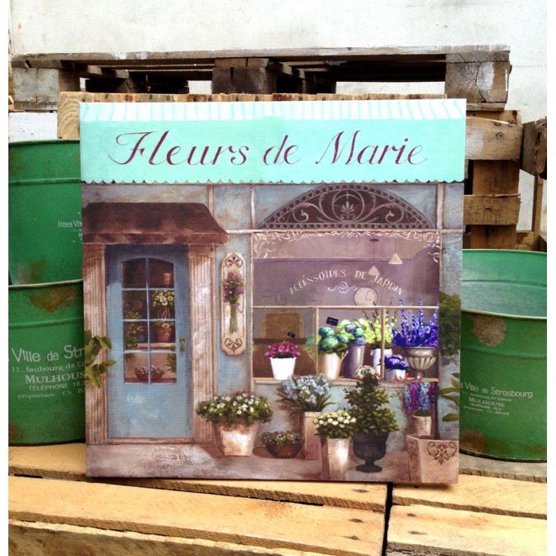 Obraz w stylu francuskim wykonany na sosnowej ramie przedstawiający francuską kwiaciarnię z kwiatami przed nią i na witrynie.
