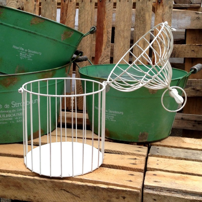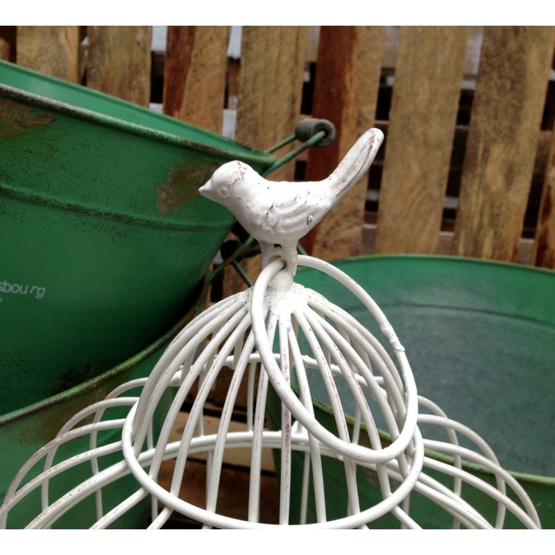 Prześliczna, dekoracyjna klatka metalowa o kremowym kolorze na ktorym widoczne sa brązowe przetarcia. Klatkę można postawić lub powiesić we wnętrzu, a także w ogrodzie, gdzie może służyć jako urocza dekoracja, miejsce na świeczkę lub aranżację z kwiatów sztucznych czy doniczkowych.