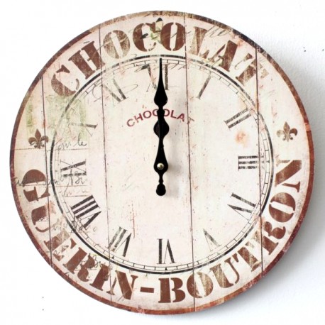 Zegar kuchenny retro z brązowym napisem CHOCOLAT i innymi francuskimi napisami. Jest to zegar idealny do kuchni oraz na prezent dla każdego miłośnika czekolady. Mechanizm zegara znajduje się z tyłu i jest zasilany jedną standardową baterią AA.