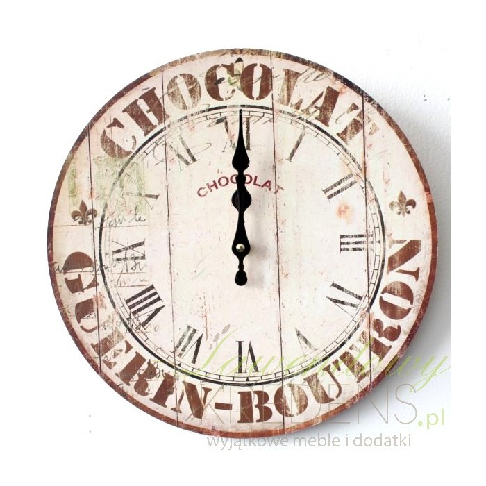 Okrągłe zegary w stylu retro z napisem CHOCOLAT, czyli zegary ścienne idealne do kuchni