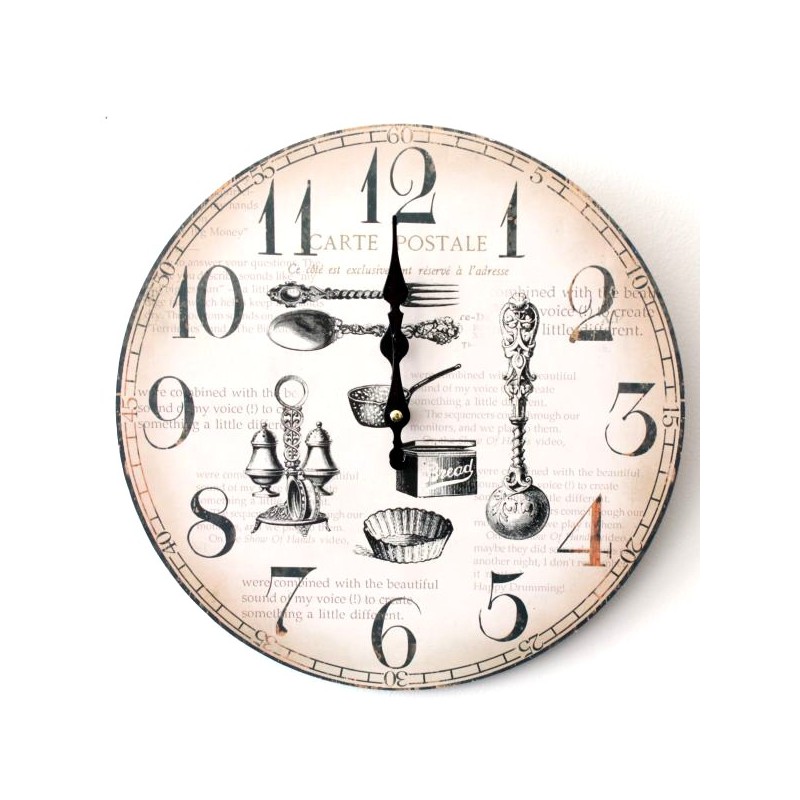 Ciekawy zegar kuchenny w stylu vintage na którym znajdują się sztućce oraz inne akcesoria kuchenne na tle angielskich i francuskich napisów.